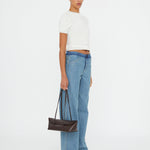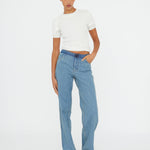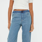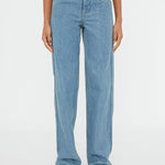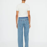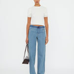 Flattering proportions are reinvented through this slouchy wide leg jean. Cut in a light washed denim, finished with a contrast deconstructed waistband.