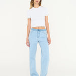 Flattering proportions are reinvented through this slouchy wide leg jean. Cut in a light washed denim, finished with a contrast deconstructed waistband.