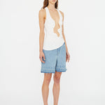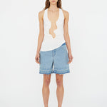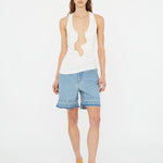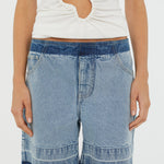 Evolved from the brands signature deconstruct silhouette. Flattering proportions are reinvented through this slouchy wide leg short. Cut in indigo washed denim, finished with a contrast deconstructed waistband.