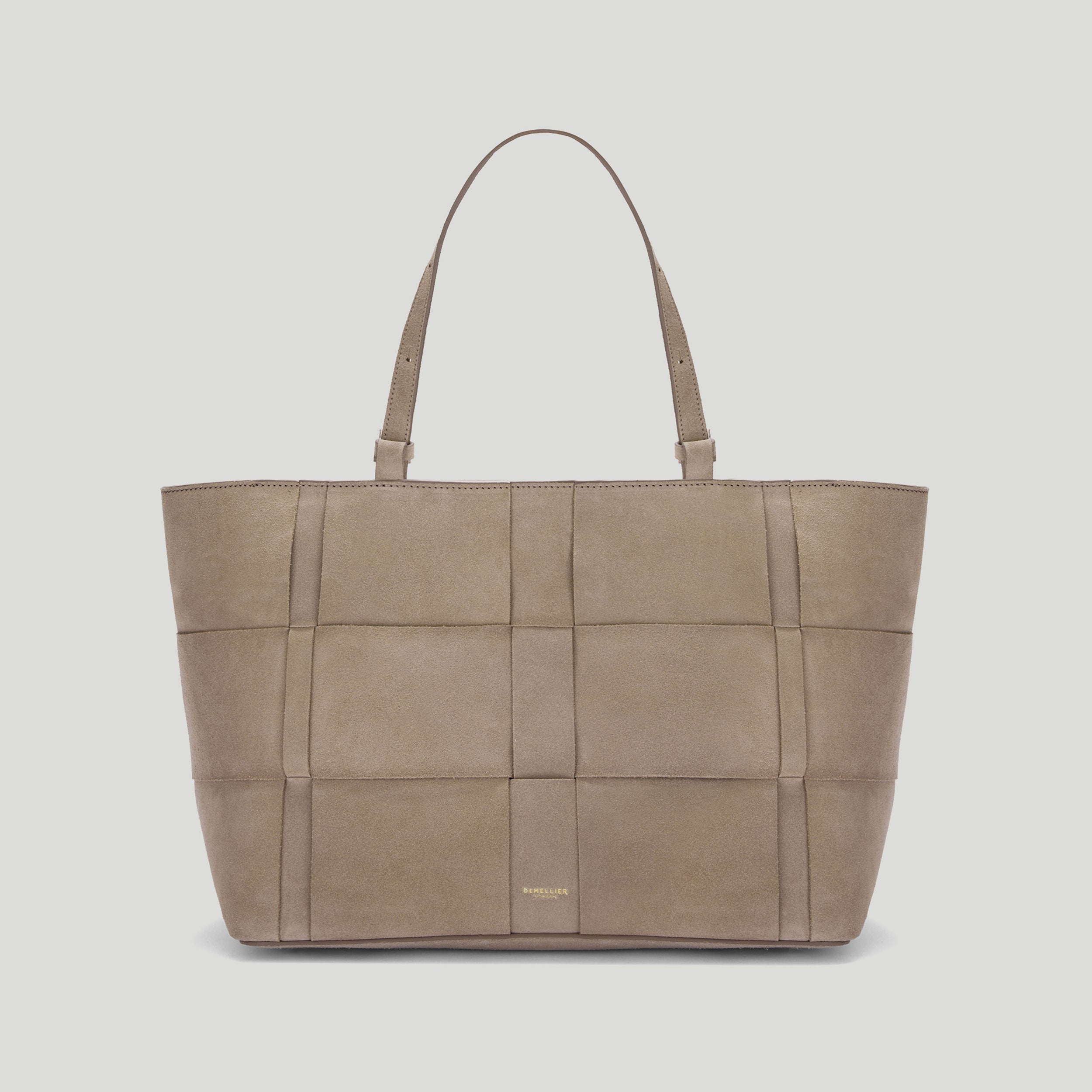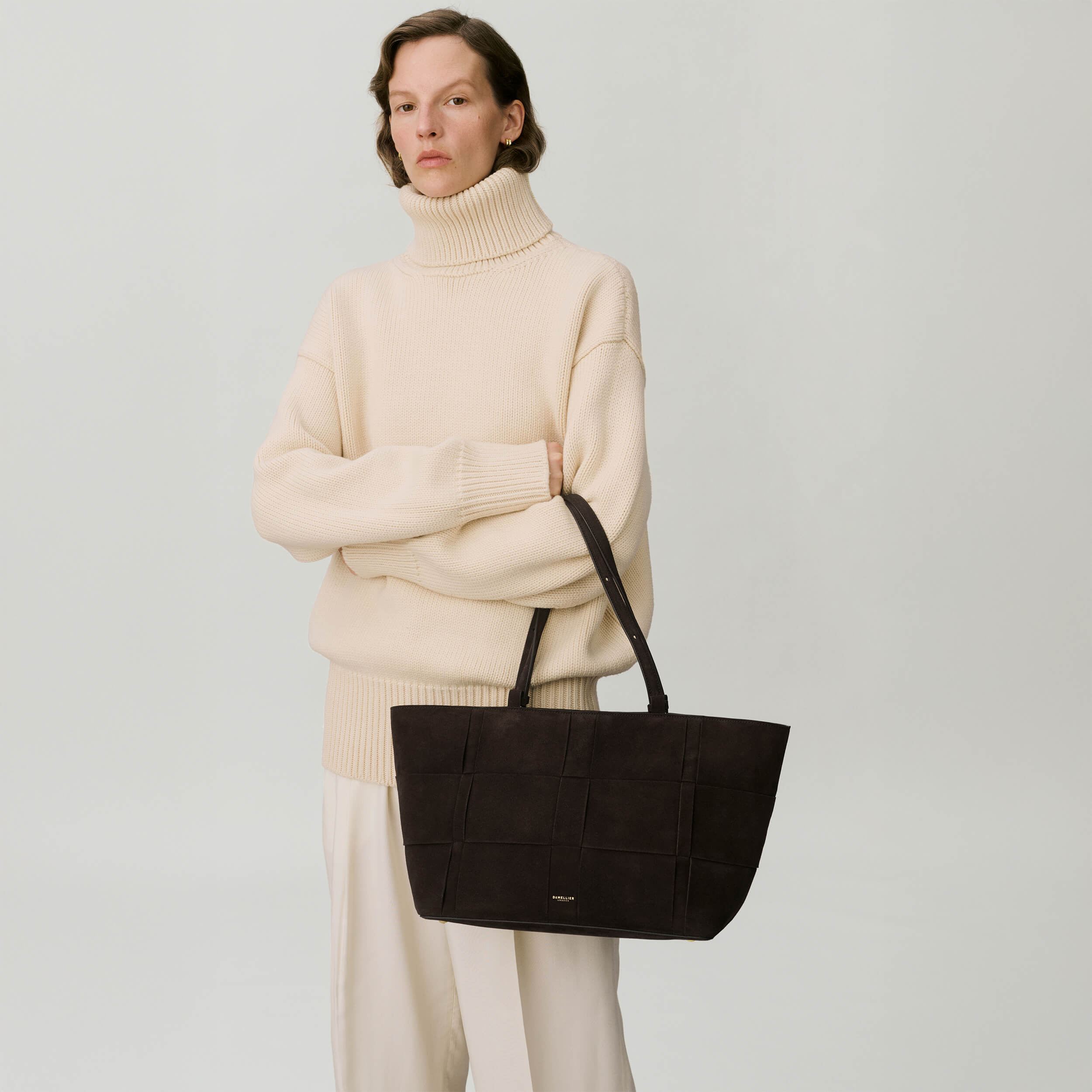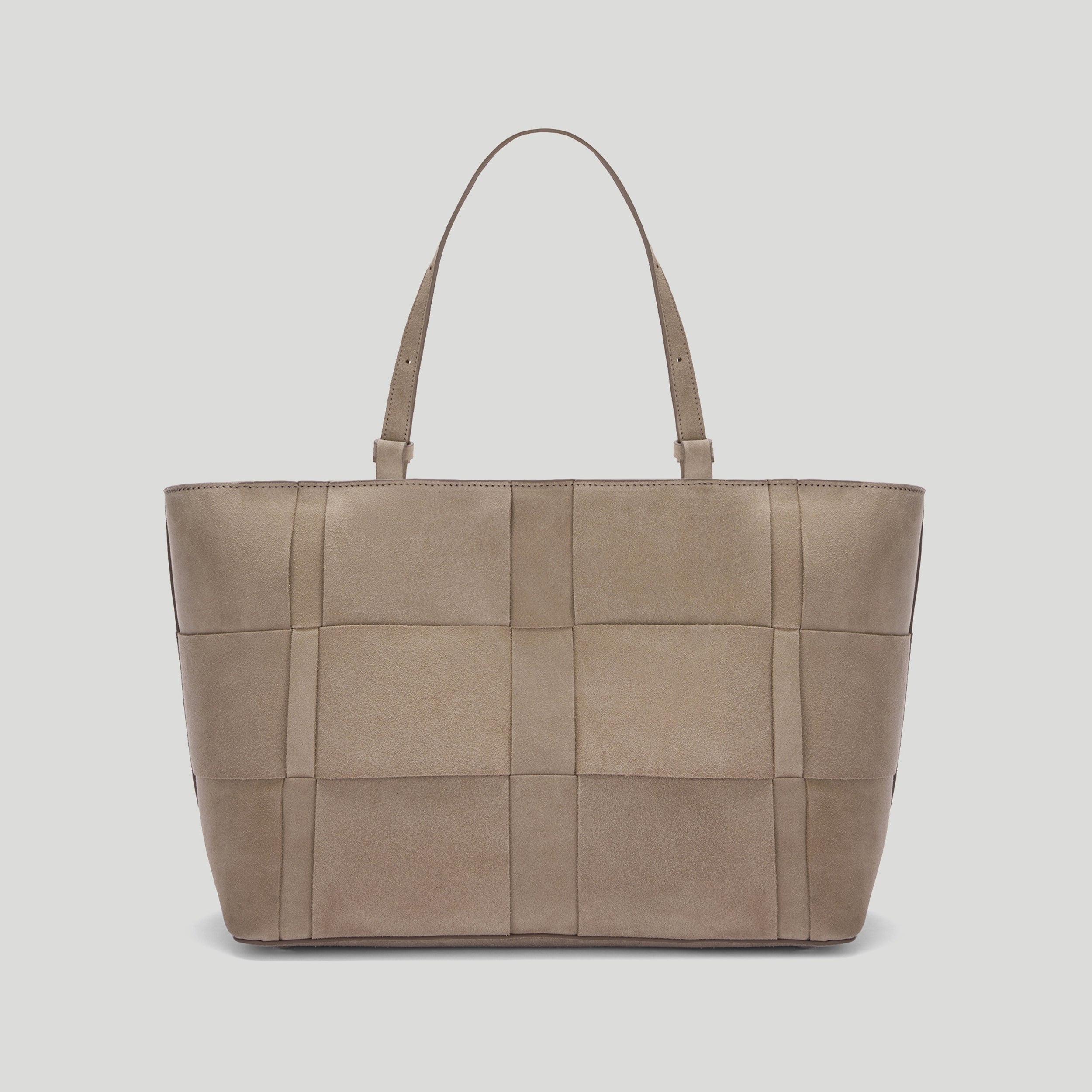Exterior: Woven leather exterior with an alternating-width pattern and soft, relaxed handfeel. Adjustable leather handles with gold-plated hardware. A sunken zip closure maintains a clean top line, while four metal feet protect the base.