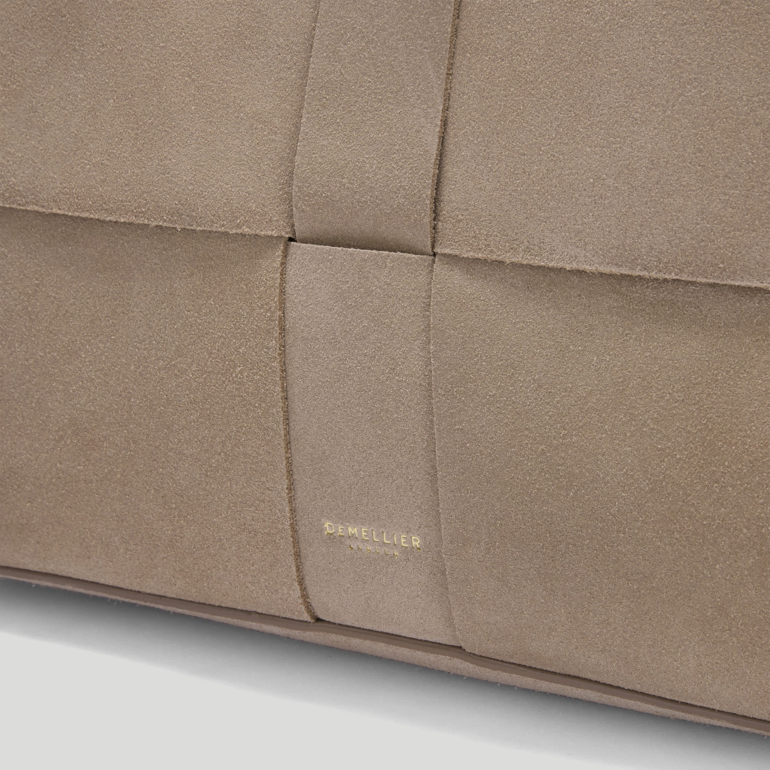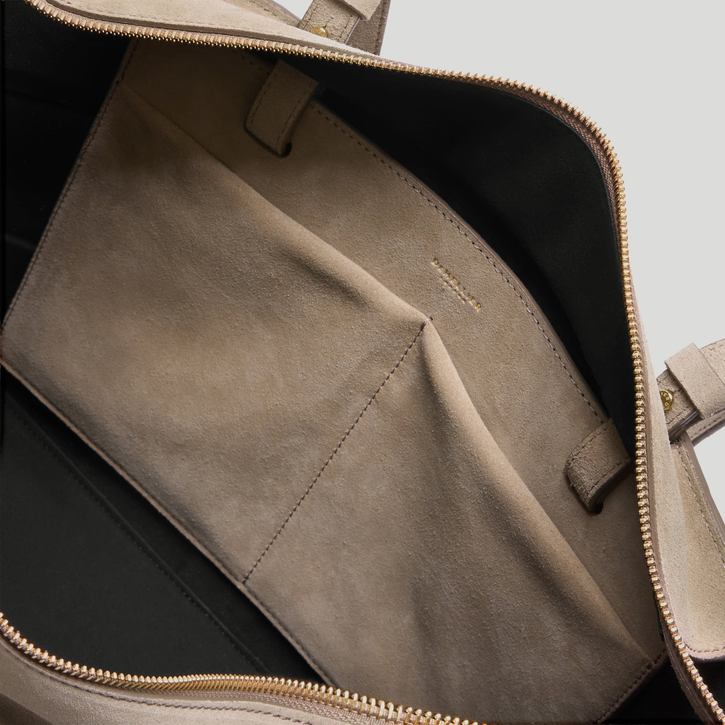 Interior: A spacious main compartment that easily fits a laptop and A4 documents, secured by a metal zip with a sleek leather zip puller. Hanging leather pockets that fit up to an iPhone Pro Max and a passport, accented with DeMellier foil logo.