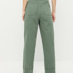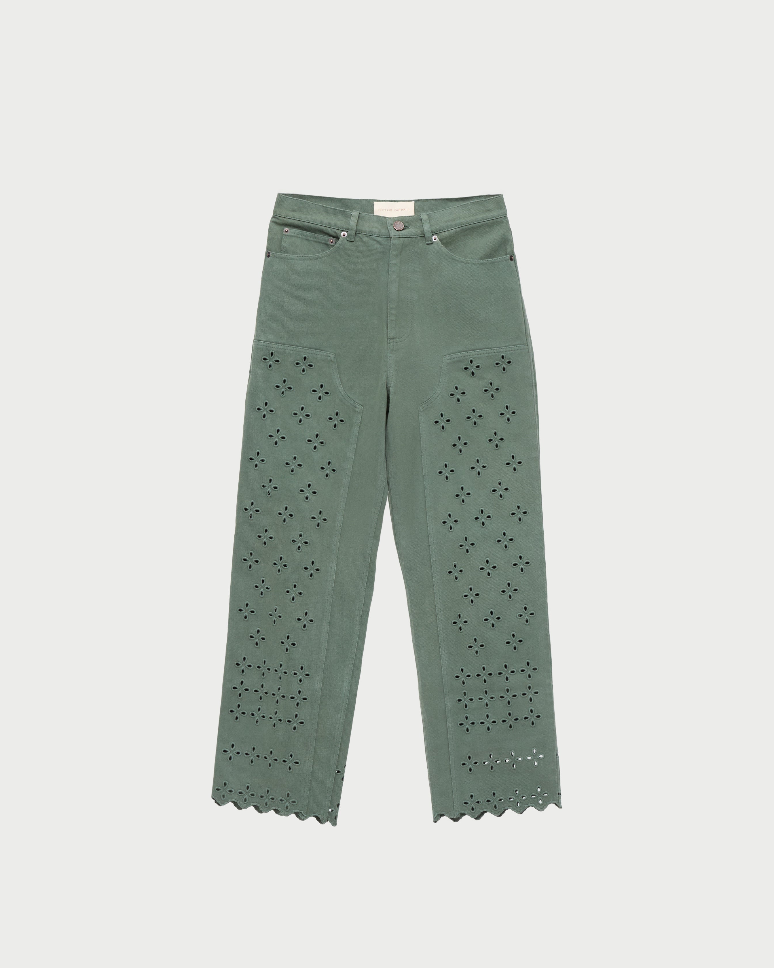 Carpenter-style pant in sage-colored denim with eyelet lace cutout detailing on the front panels. Features a fixed waist and a scalloped hem.