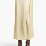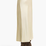 A fluid midi skirt in luminous satin that is cut on the bias for a body-skimming fit. Draped detail at folded front. Concealed zipper closure at left side.