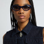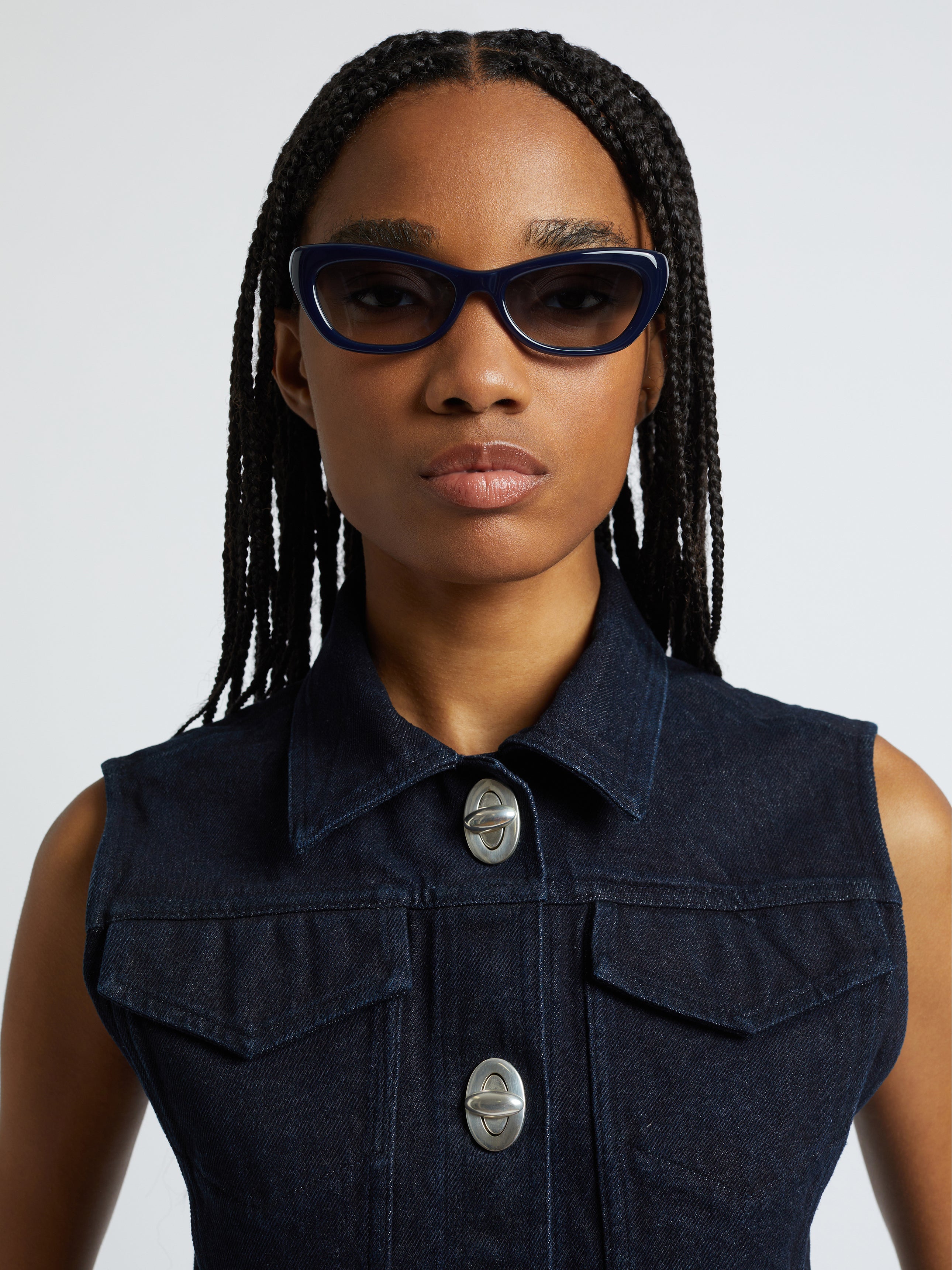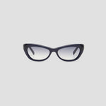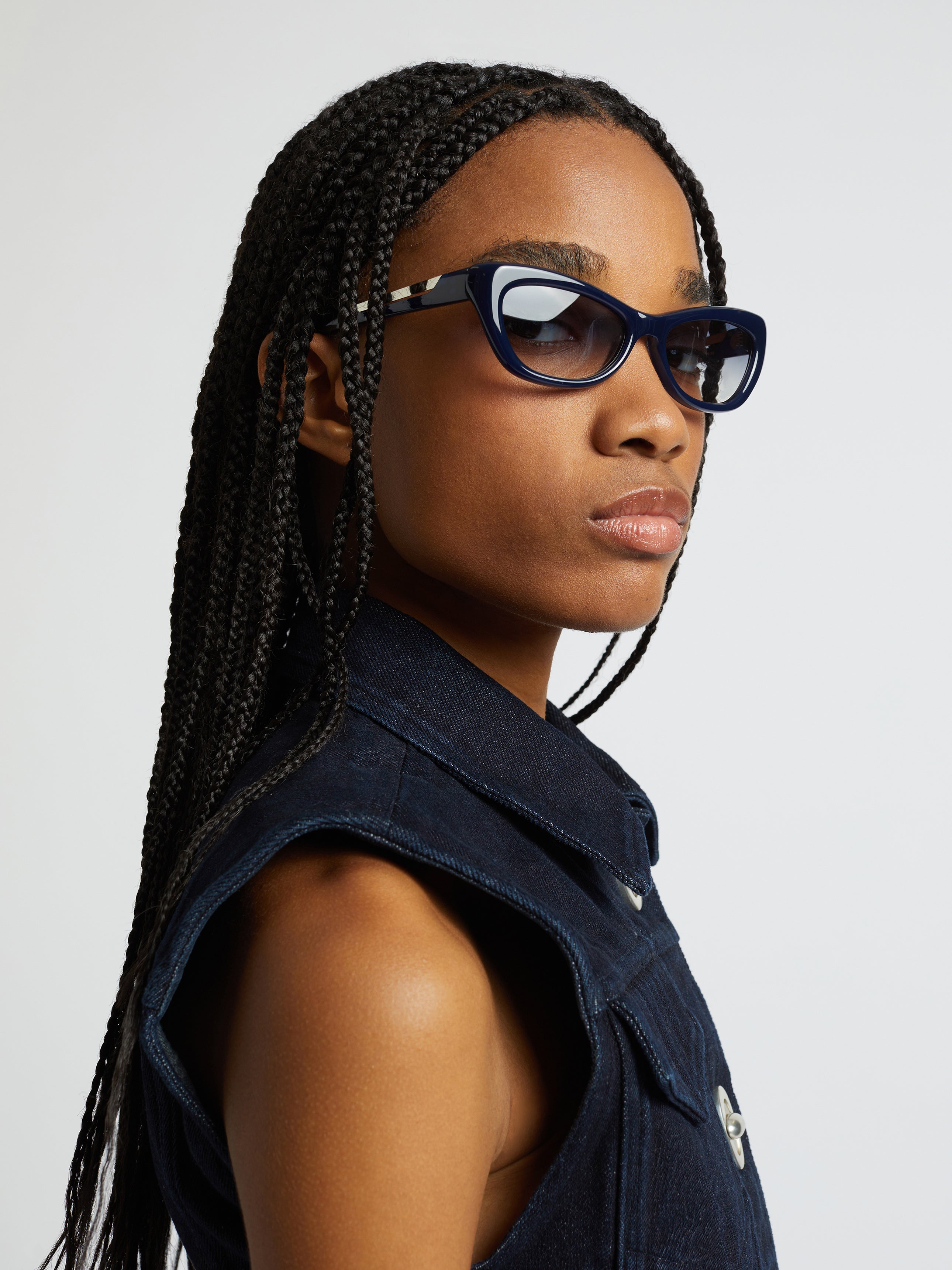 The Dillon 95 sunglasses have a sleek, high-shine acetate frame with unique, cutaway features, exposing the metal structure at the temples to create a bold, flattering look.