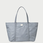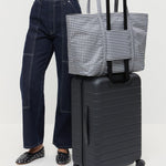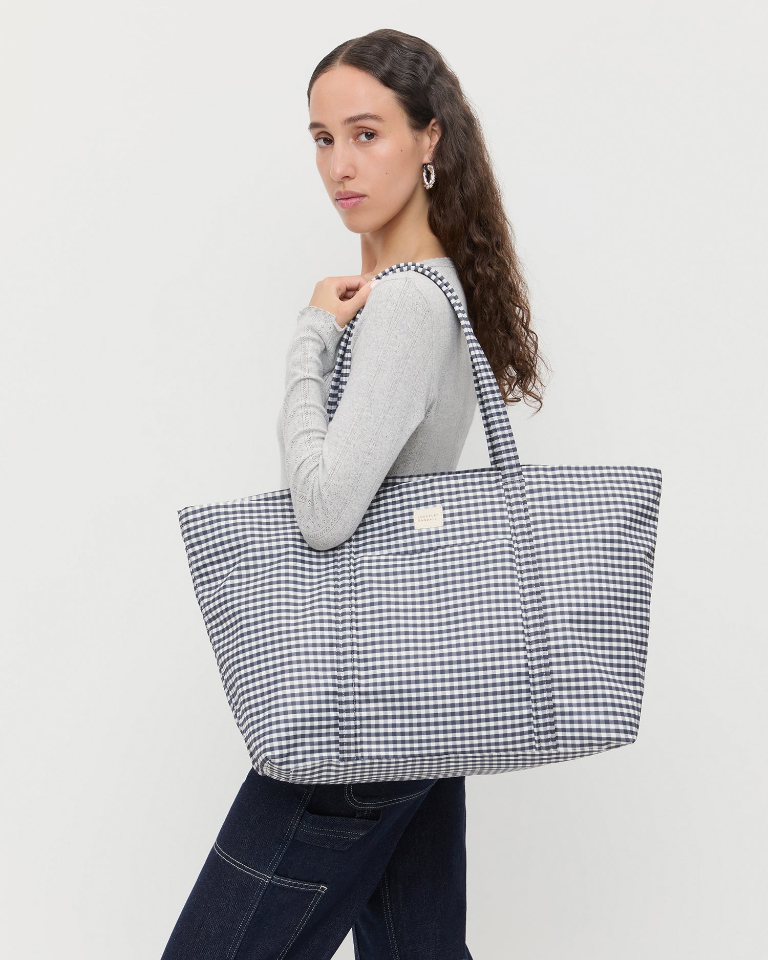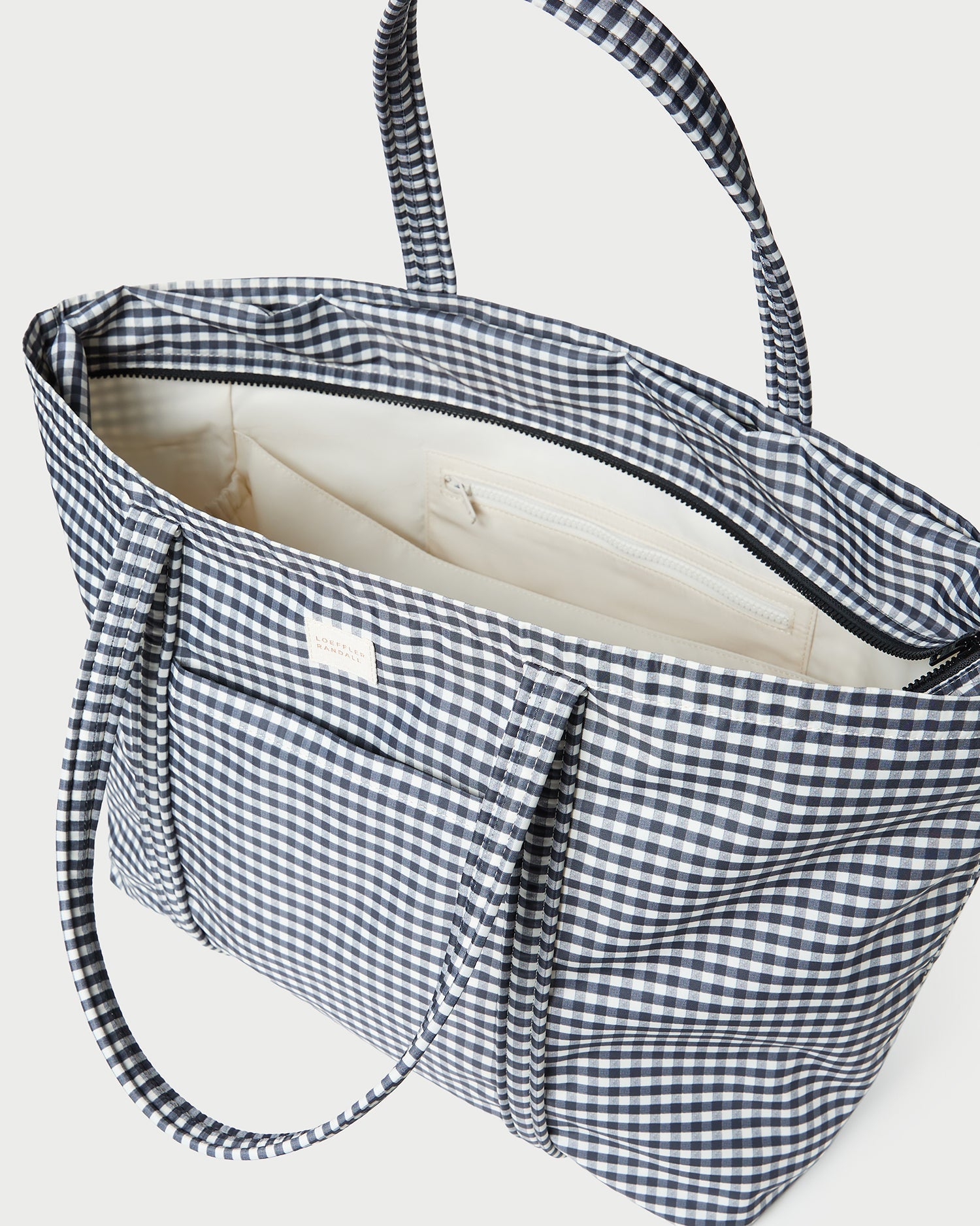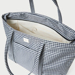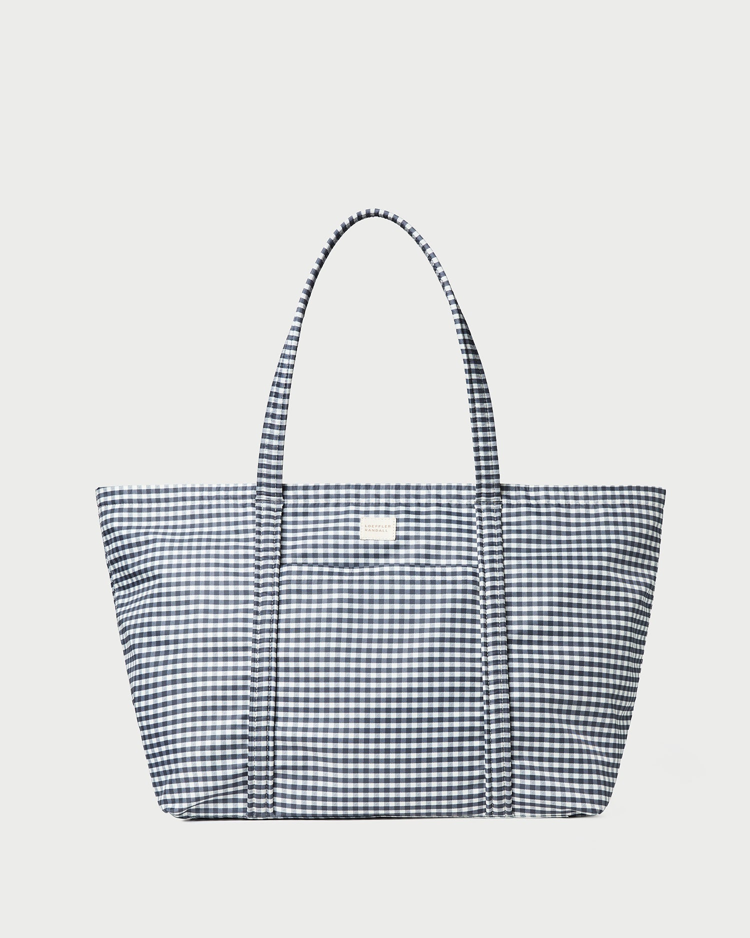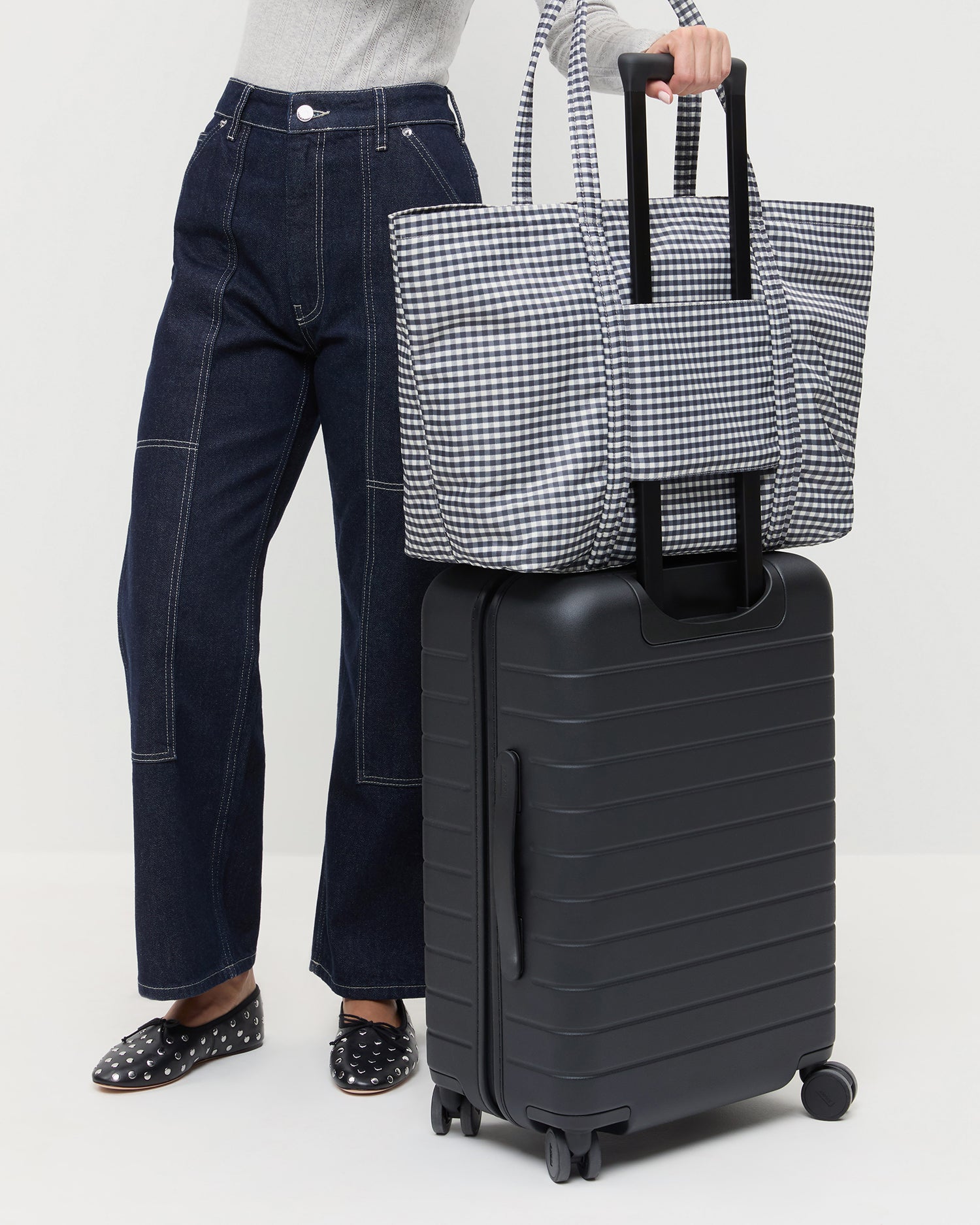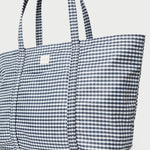 Tote bag in black and white gingham washed nylon. Features two shoulder straps, a top zipper closure, and an exterior cotton logo patch. Also includes exterior pockets with zipper closure, interior pockets for easy organization, and an exterior back panel for stacking on luggage.
