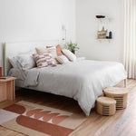 Handwoven horizontally on the ground to achieve maximum precision, each rug is made from 100% cotton that’s dyed and spun in-house. From prepping the yarn to weaving, washing, and finishing, each rug is made in a fair trade working environment in Jaipur, India.