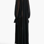 Fusing ‘90s grunge with a bohemian spirit, this fluidly formed dress is framed by a high stand collar for a regal bearing. Hand-draped silhouette animated by hand-crushed cartridge pleating, with billowing sleeves cinched at the wrist. Wear with slit neckline at front or back.