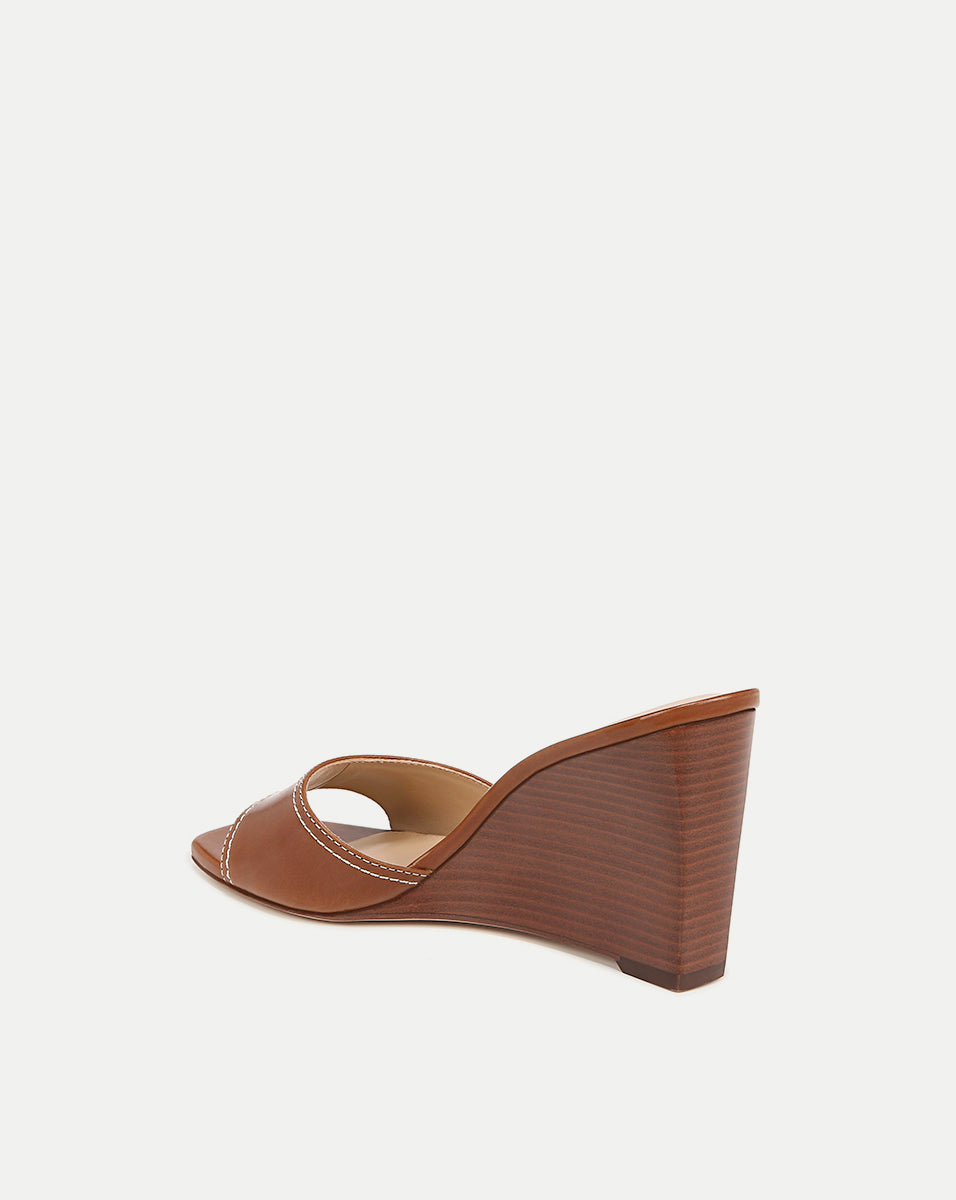 Timeless, understated, chic—the Ellen sandal is a peep-toe mule with a stacked wooden wedge heel. Crafted from smooth leather with contrast stitching, it has an on-trend Nineties feel. The cushioned footbed and slip-on style ensure easy wear, and the polished silhouette pairs well with dresses and jeans alike.