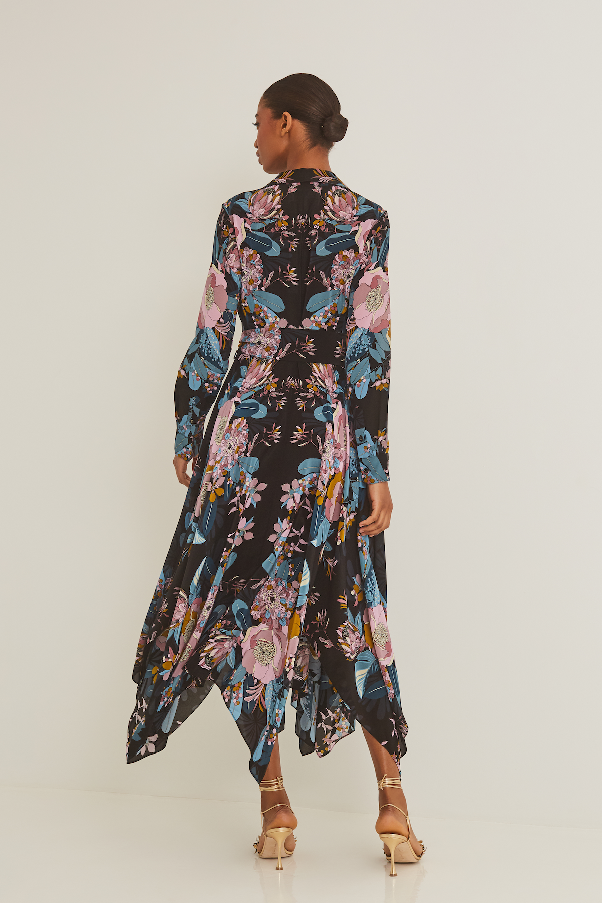 • Long sleeve button down shirtdress with flowy, high-low, asymmetrical hem
