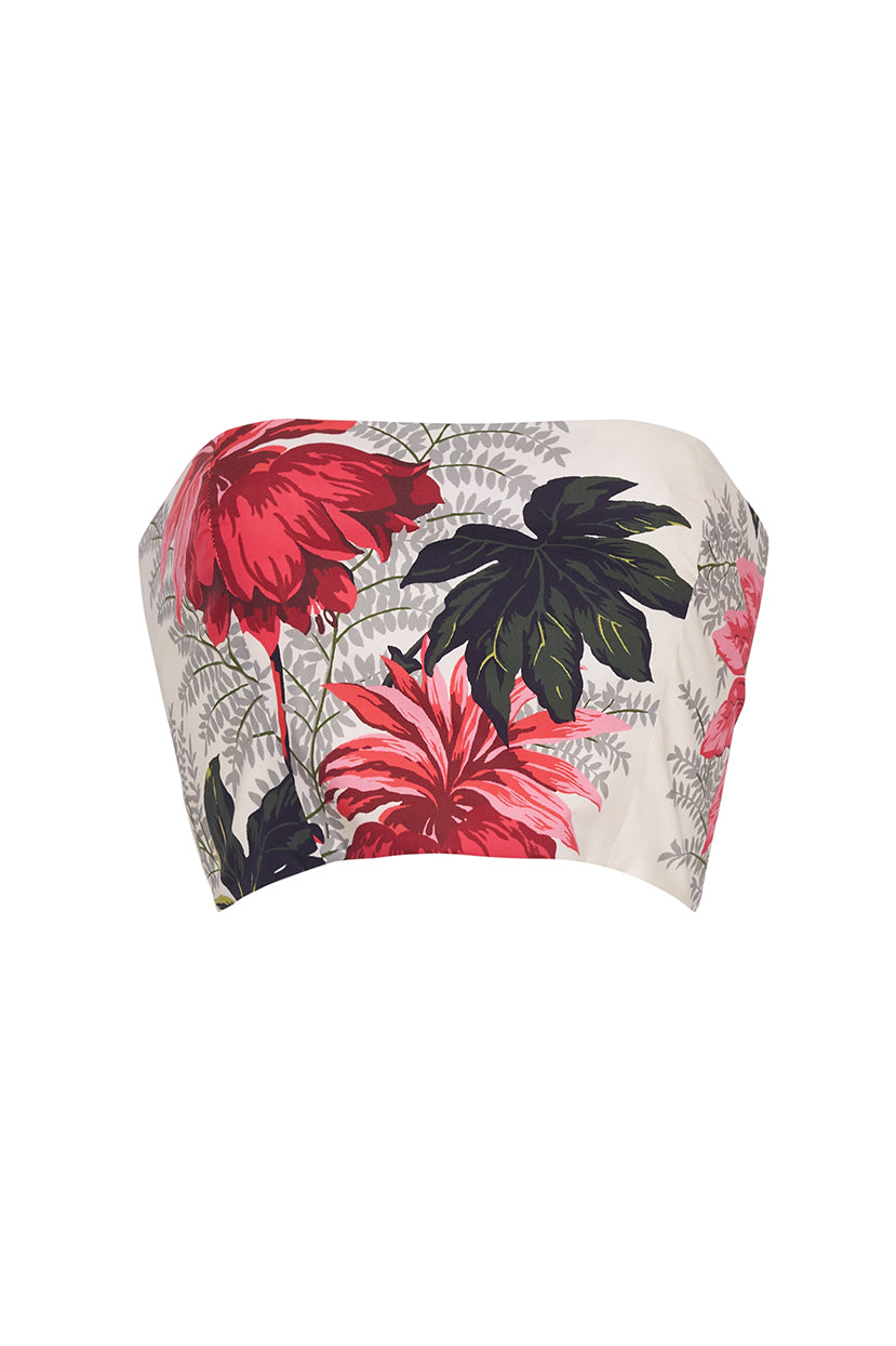 • Strapless bustier top featuring a cropped silhouette, sweetheart neckline and boned bodice