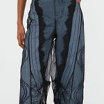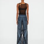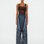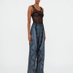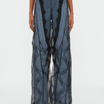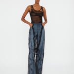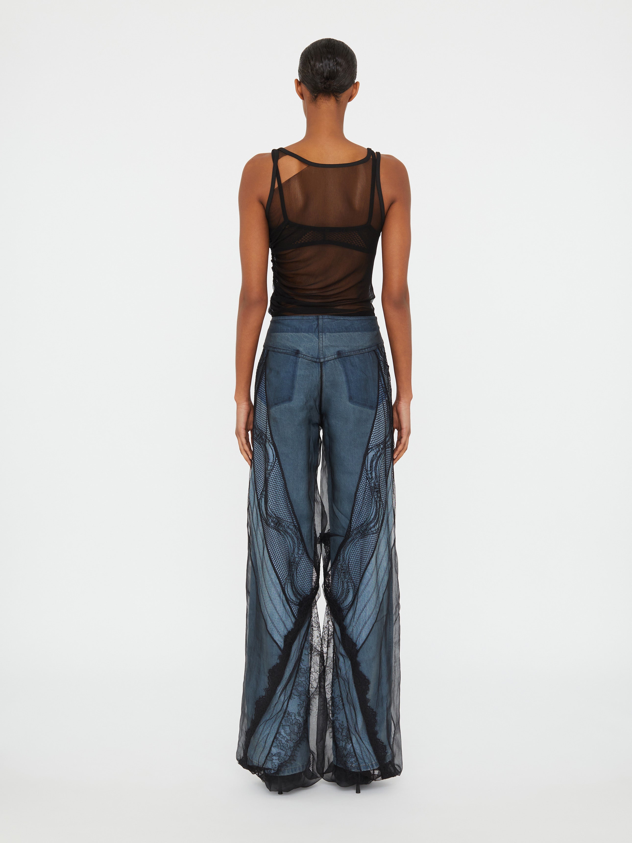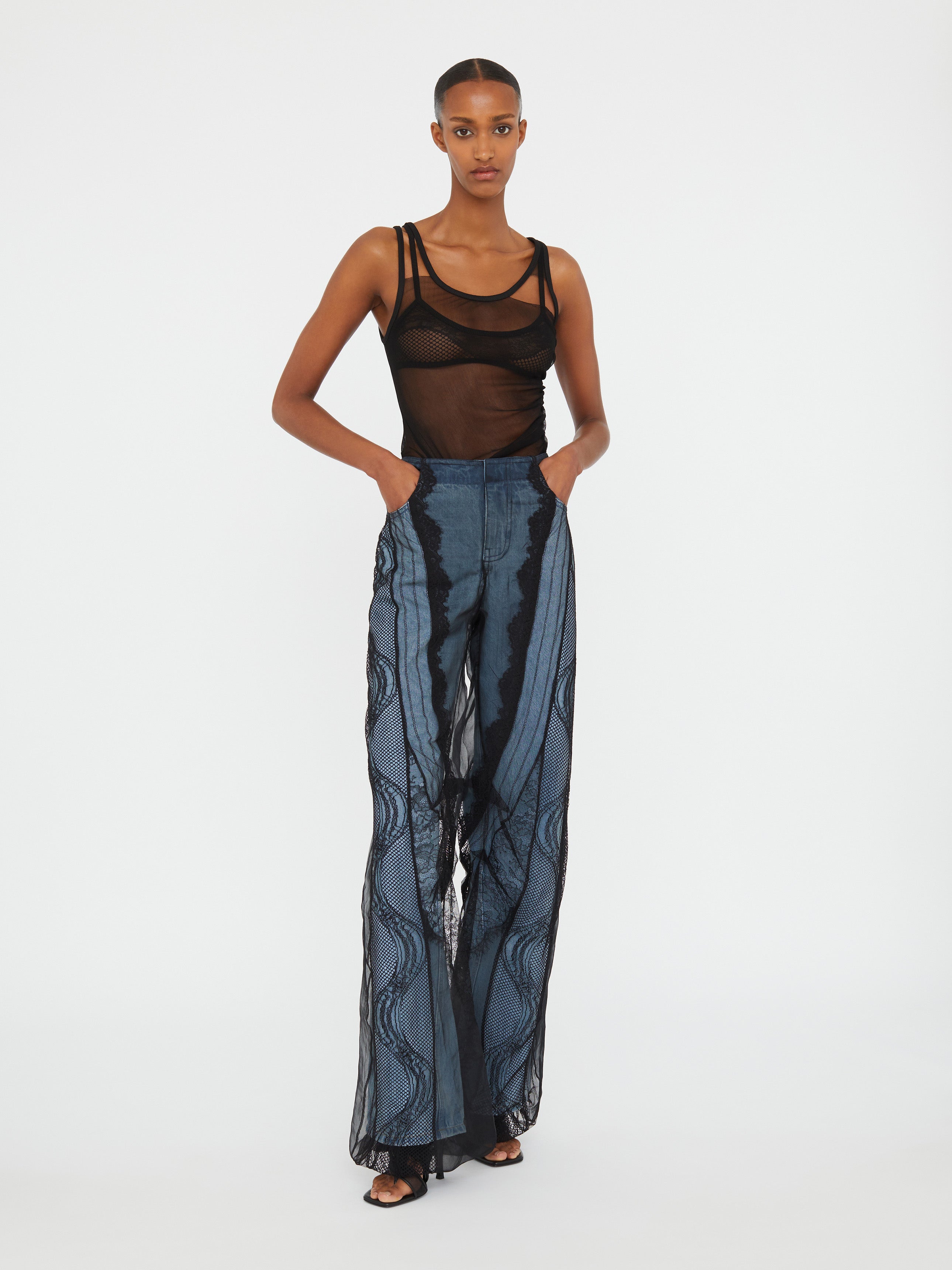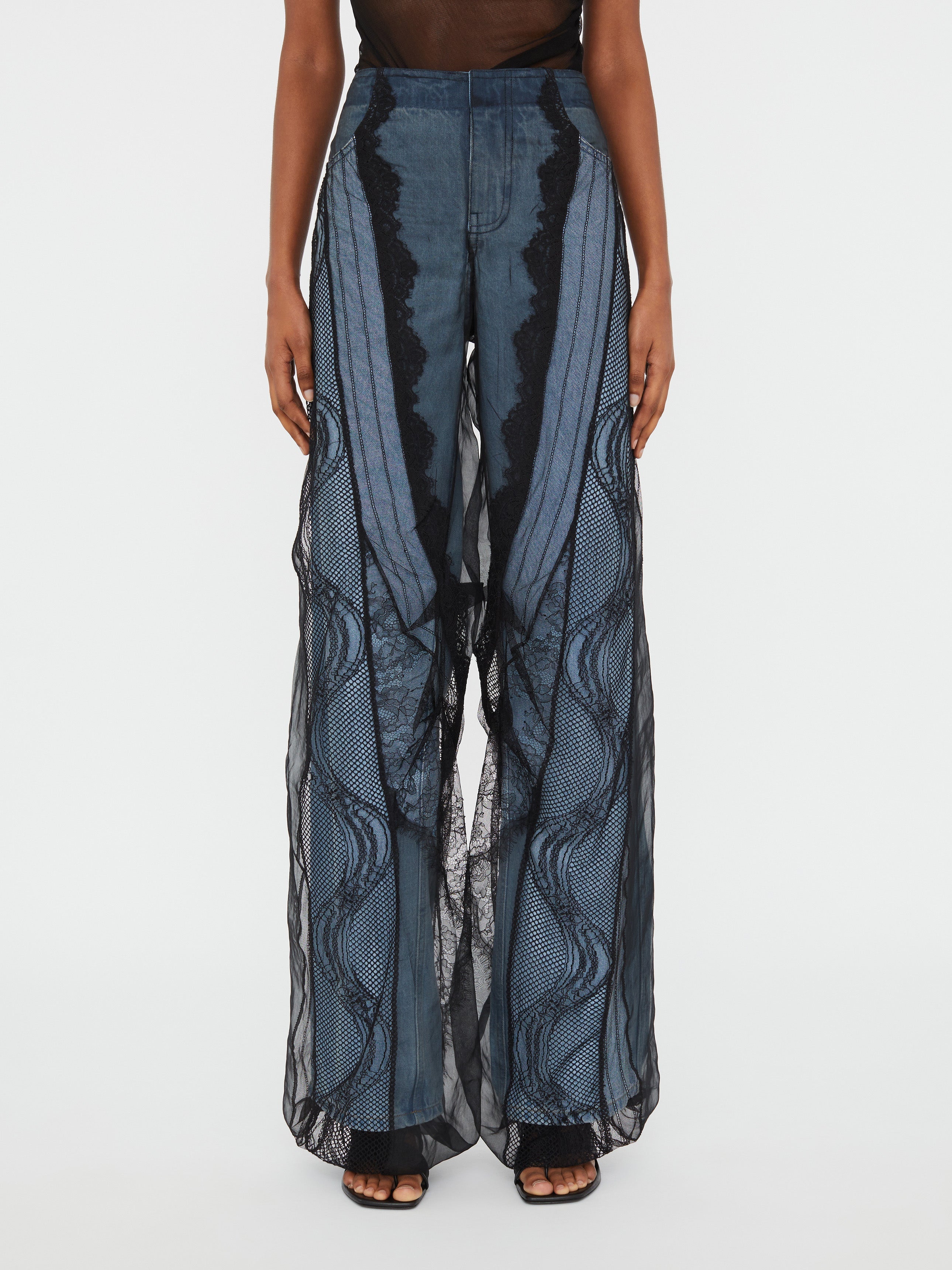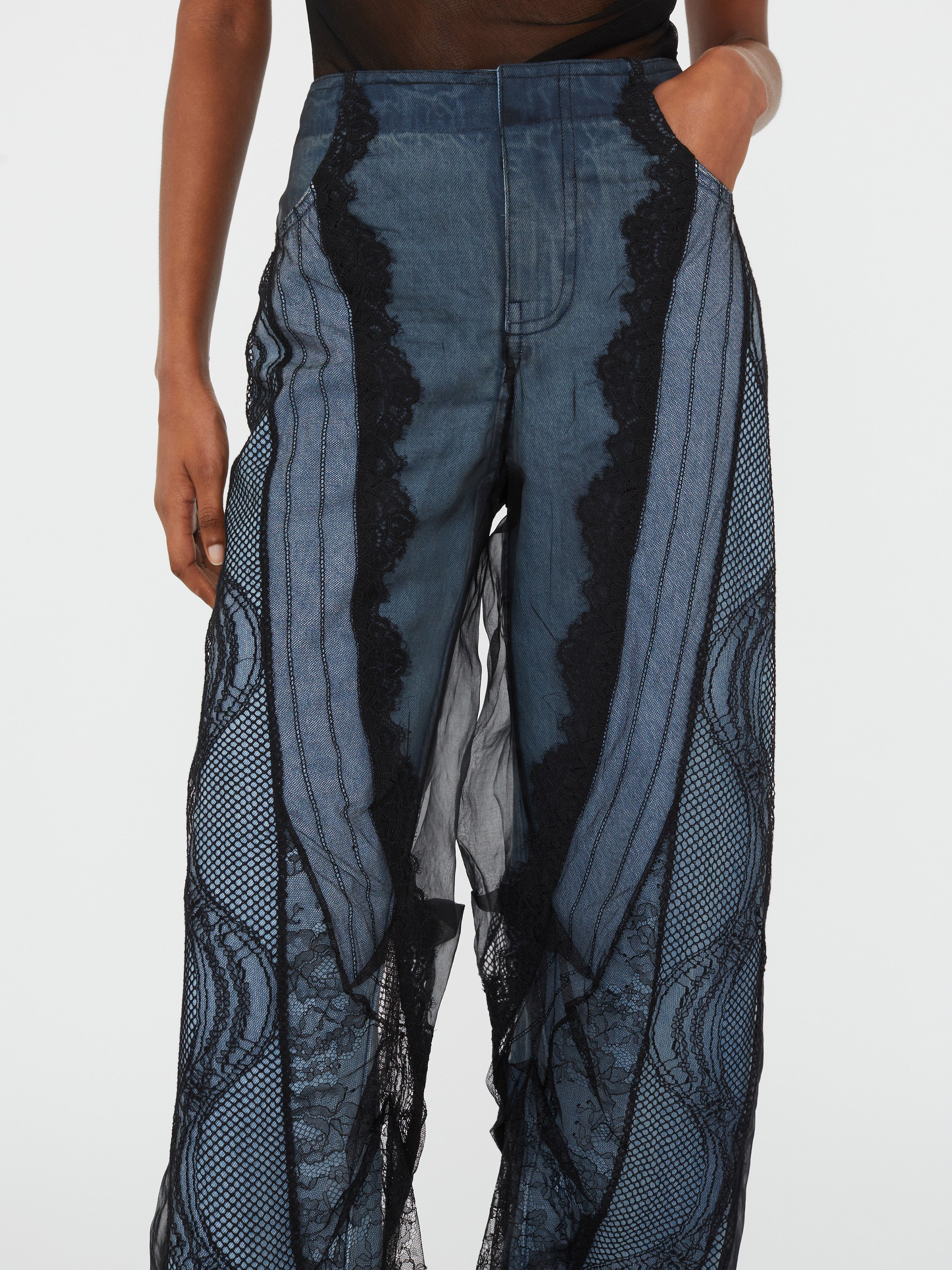 A sheath of chantilly lace layers over classic denim to create a new silhouette, and reflect a delicateness that offsets the rigid structure of the jean.
