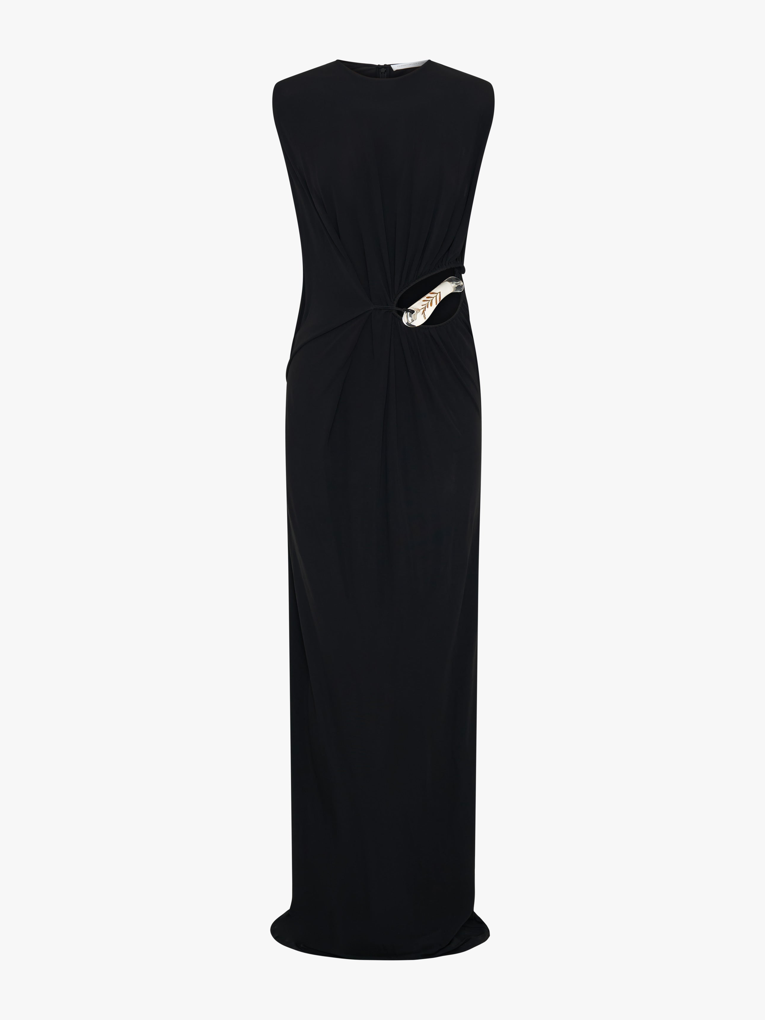 Crafted in slinky viscose jersey, this Encased Nature Suspended Jersey Tank Dress features sculptural draping through the body with a gathered cutout at the waist. A signature Christopher Esber cut out is framed by clear resin hardware, encasing preserved maidenhair fern. The silhouette falls straight with a relaxed waist and subtle contouring through the skirt.