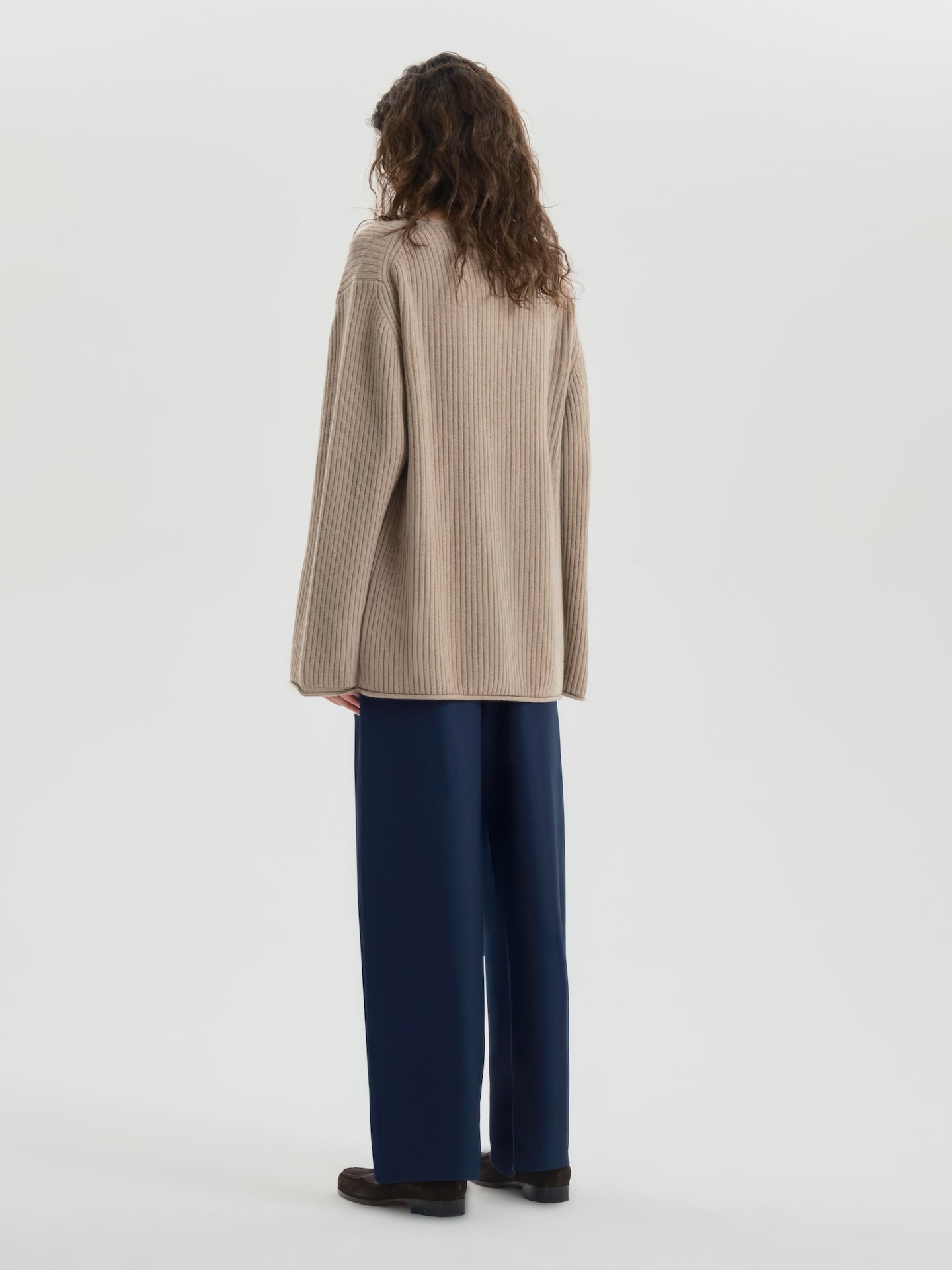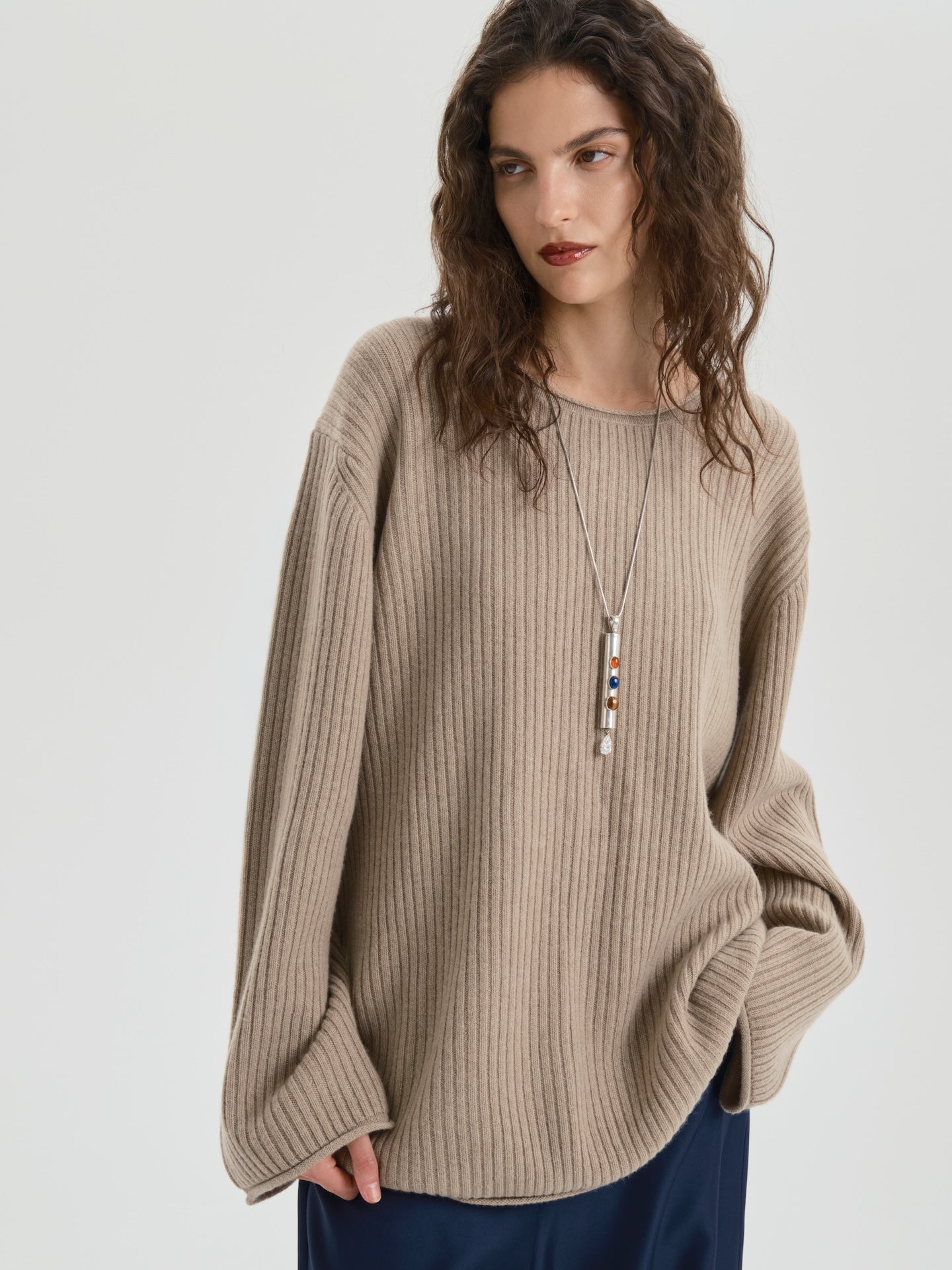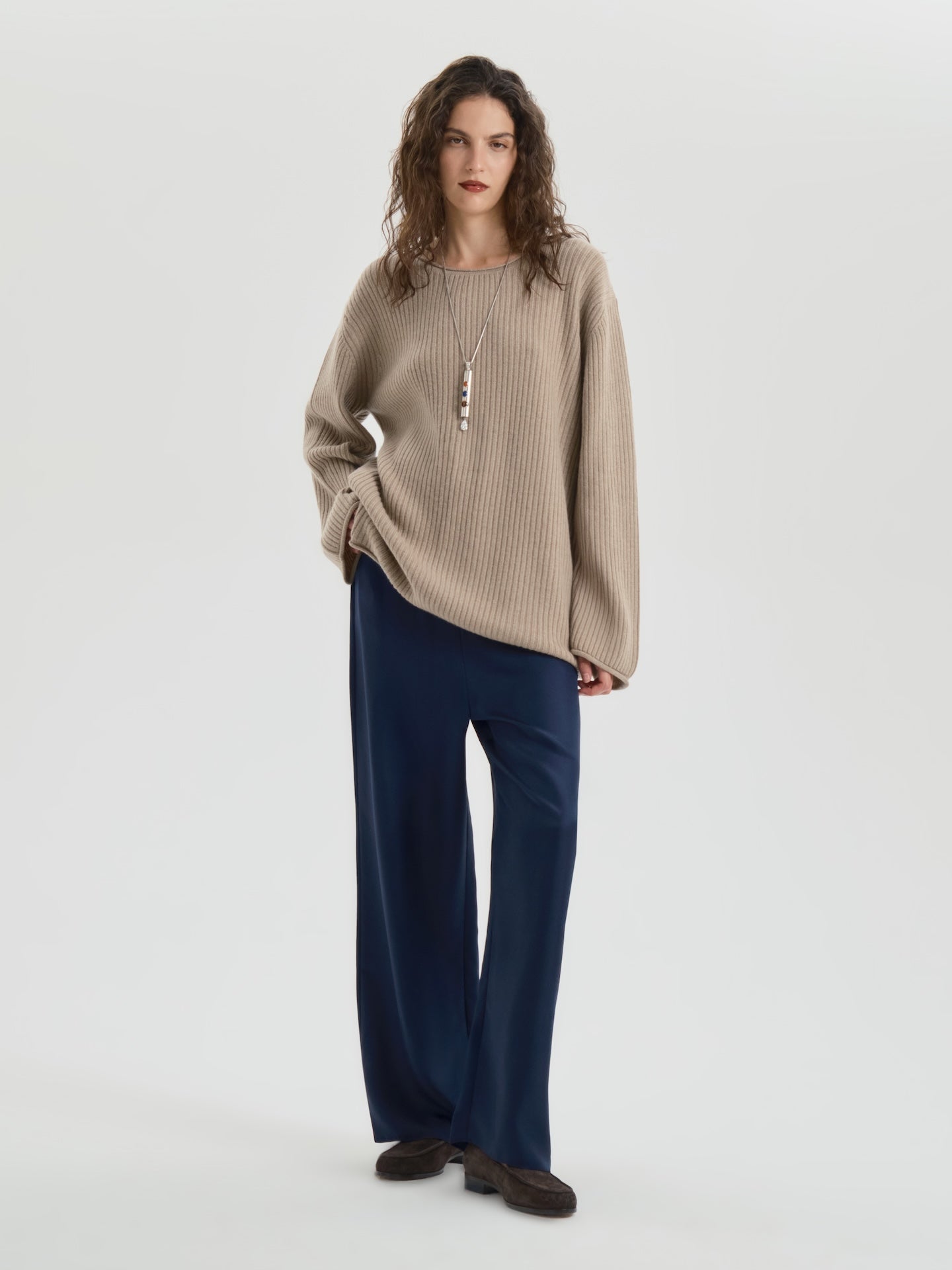 This is an oversized sweater with a wide crew neckline, relaxed sleeves, and easy proportions. Crafted in soft mid-weight cashmere with a vertical rib texture and finished with rolled jersey edges at the neckline, cuffs, and hem.