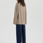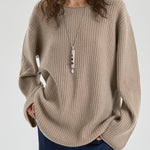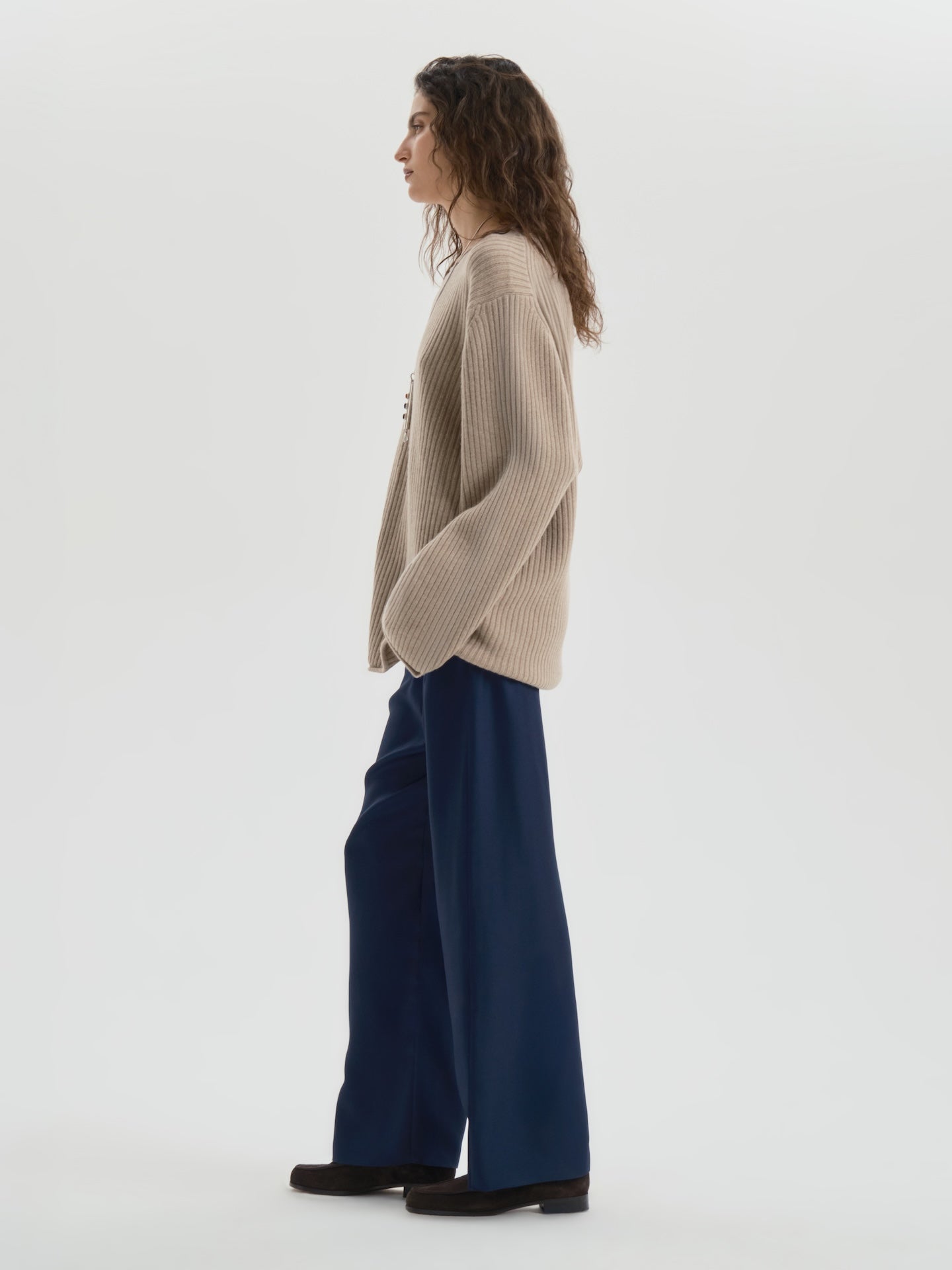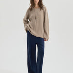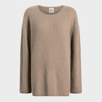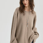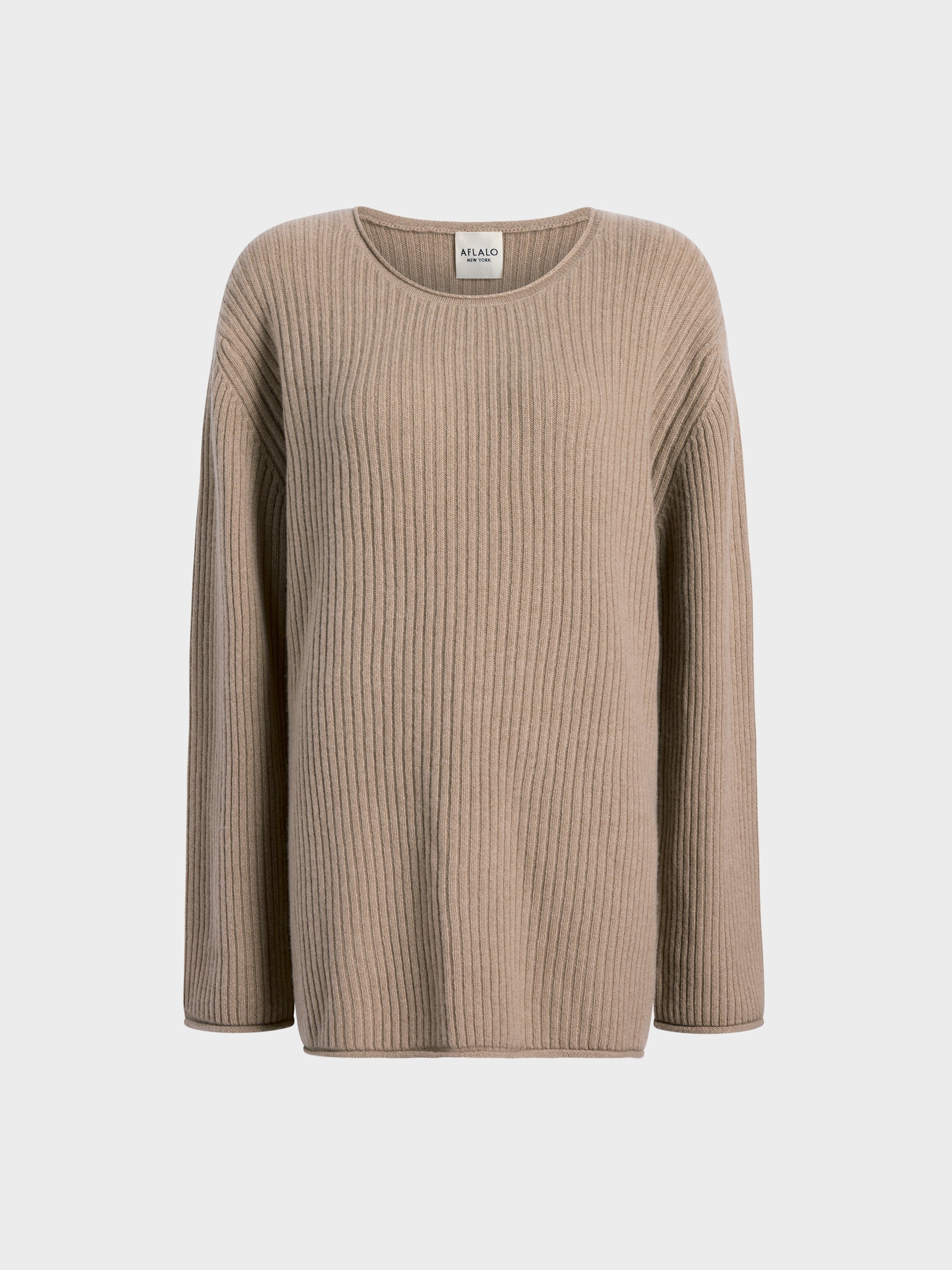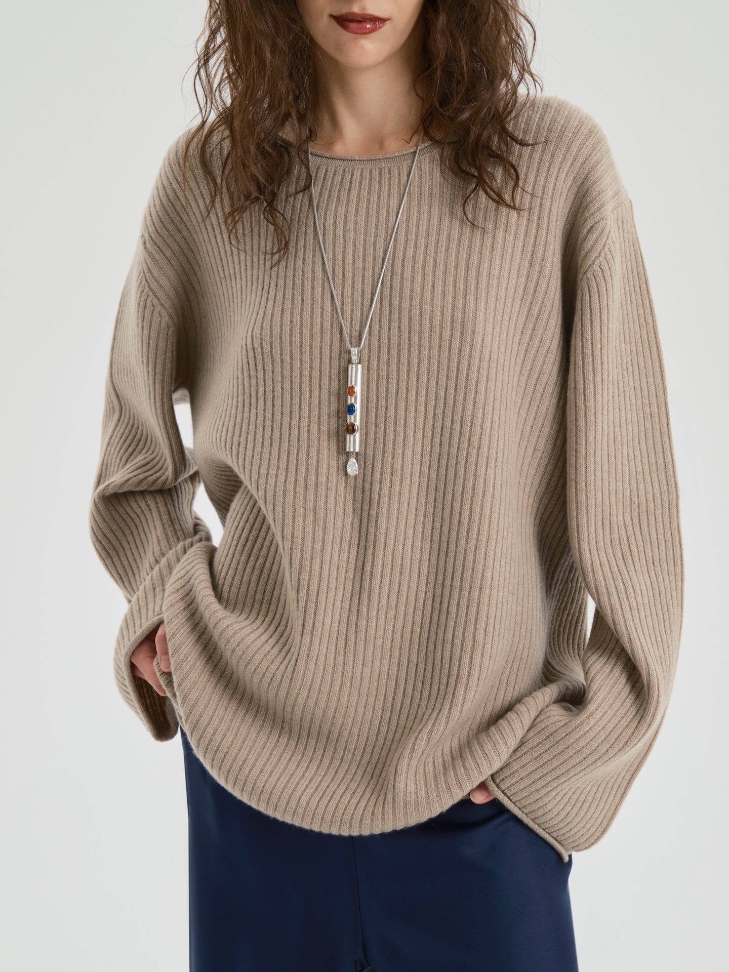 This is an oversized sweater with a wide crew neckline, relaxed sleeves, and easy proportions. Crafted in soft mid-weight cashmere with a vertical rib texture and finished with rolled jersey edges at the neckline, cuffs, and hem.