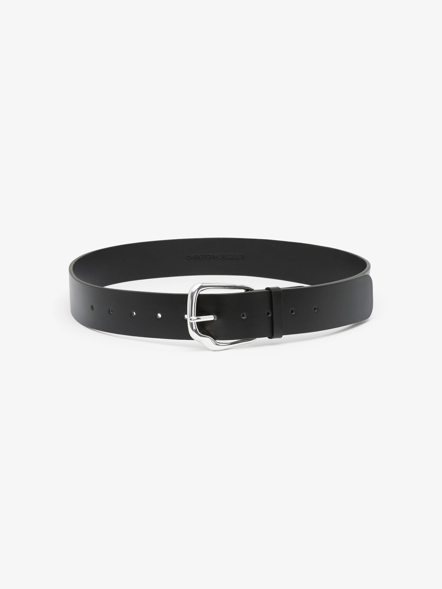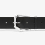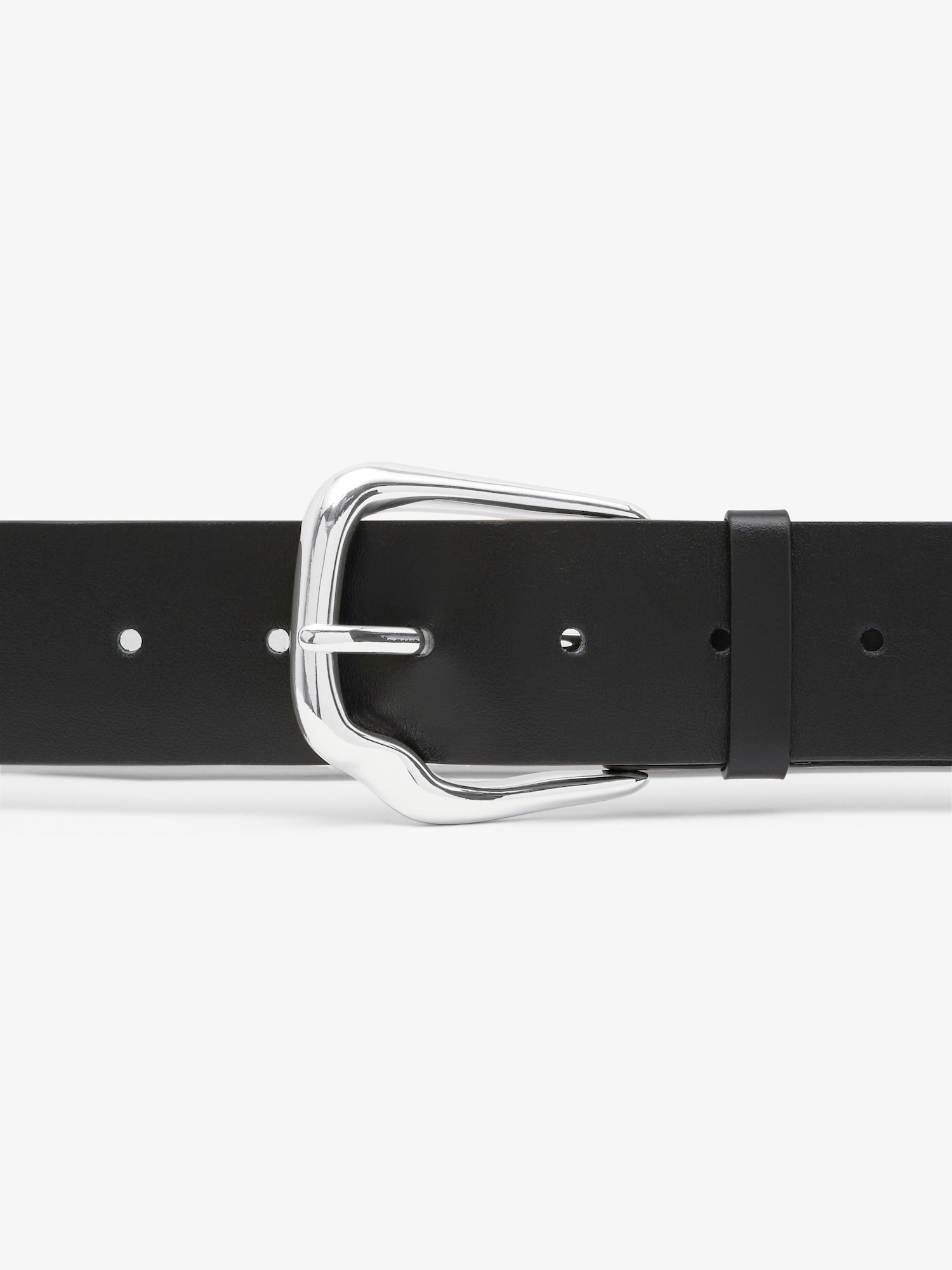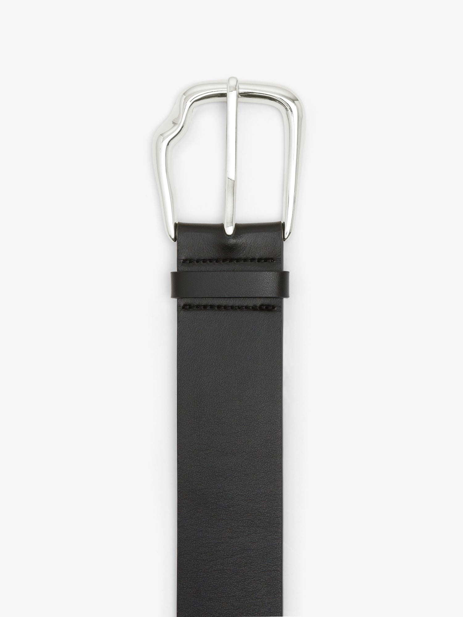 An elevated wardrobe staple. The Fender Leather Belt in Black is crafted in smooth leather and finished with a custom silver buckle, sculptural and timeless. Designed to cinch soft tailoring or slip seamlessly through denim loops.