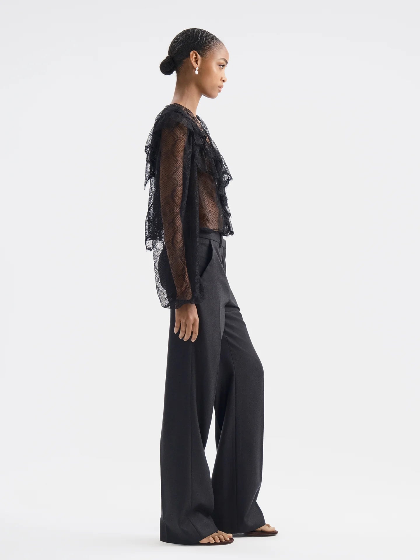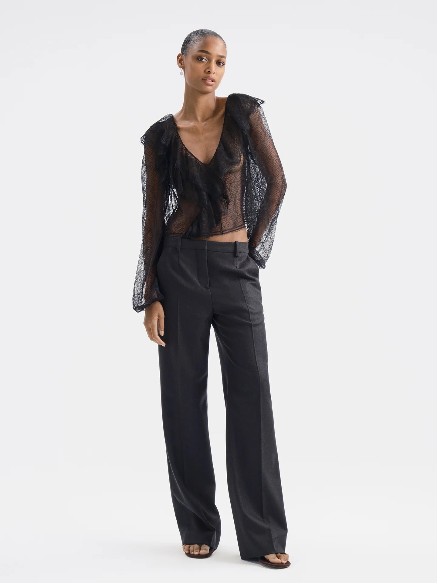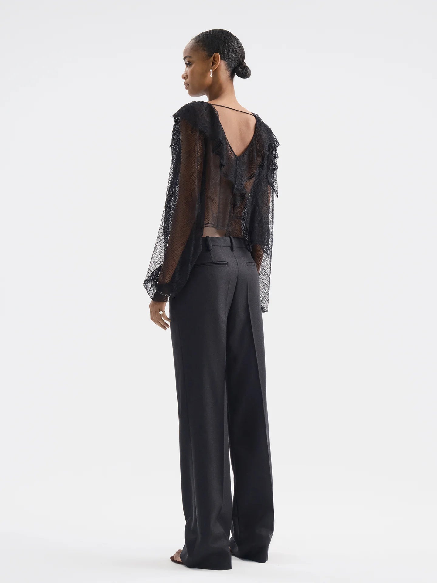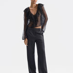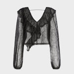 V-neck lace top featuring asymmetrical ruffles that drape softly across the front, back, and just over the shoulders. Made from deadstock lace sourced in France, each piece may vary in lace pattern and sheerness.