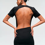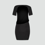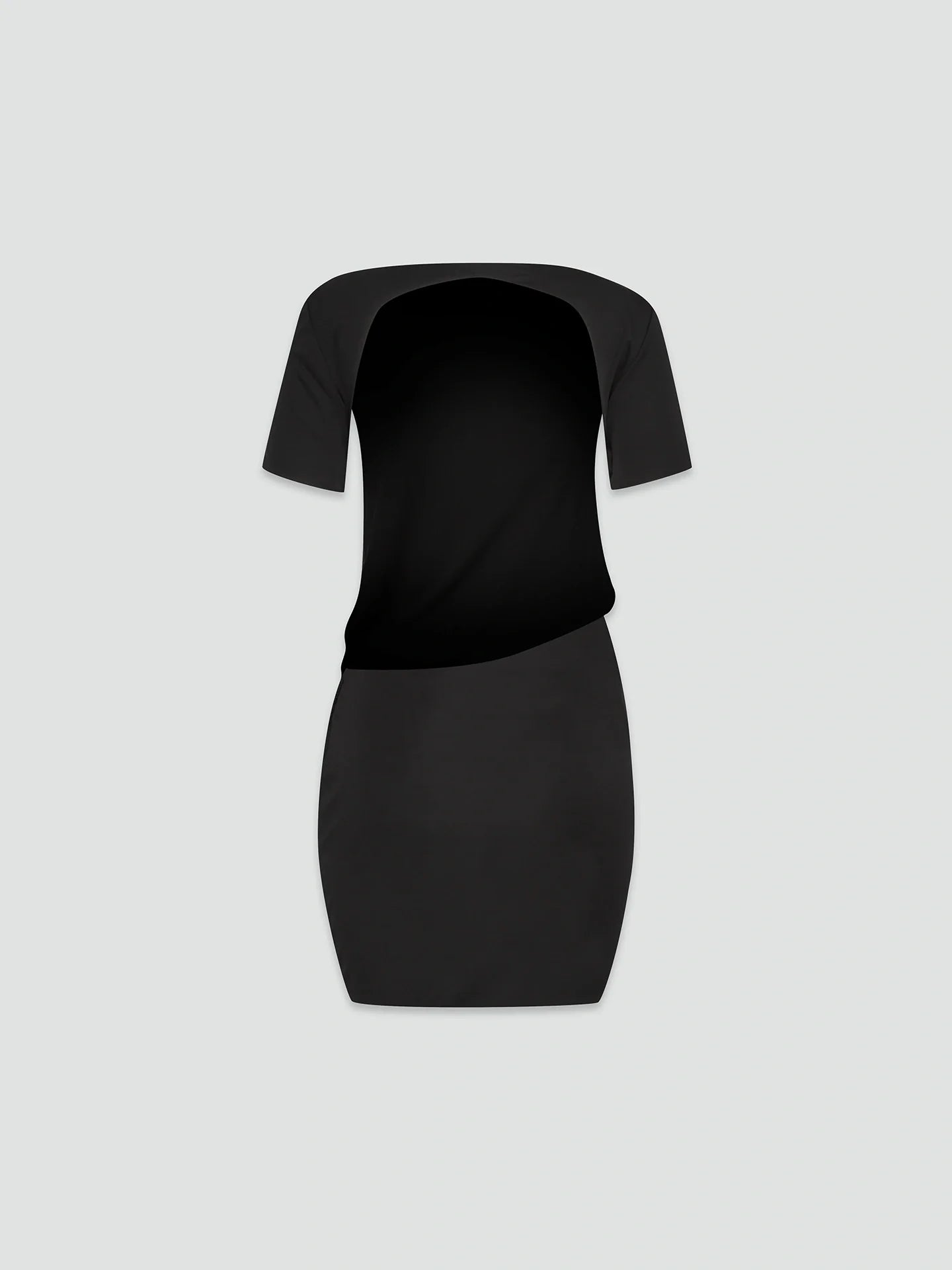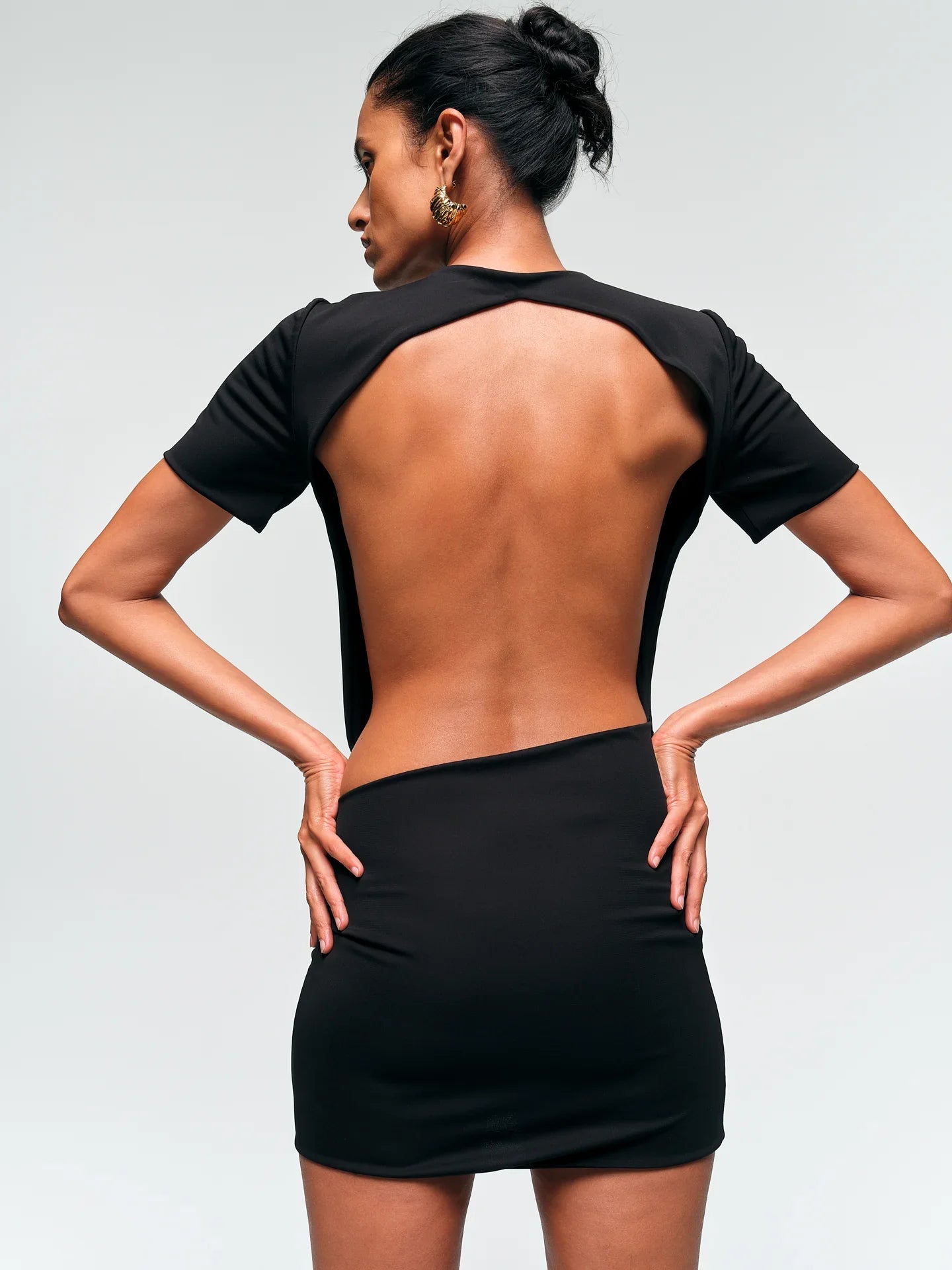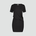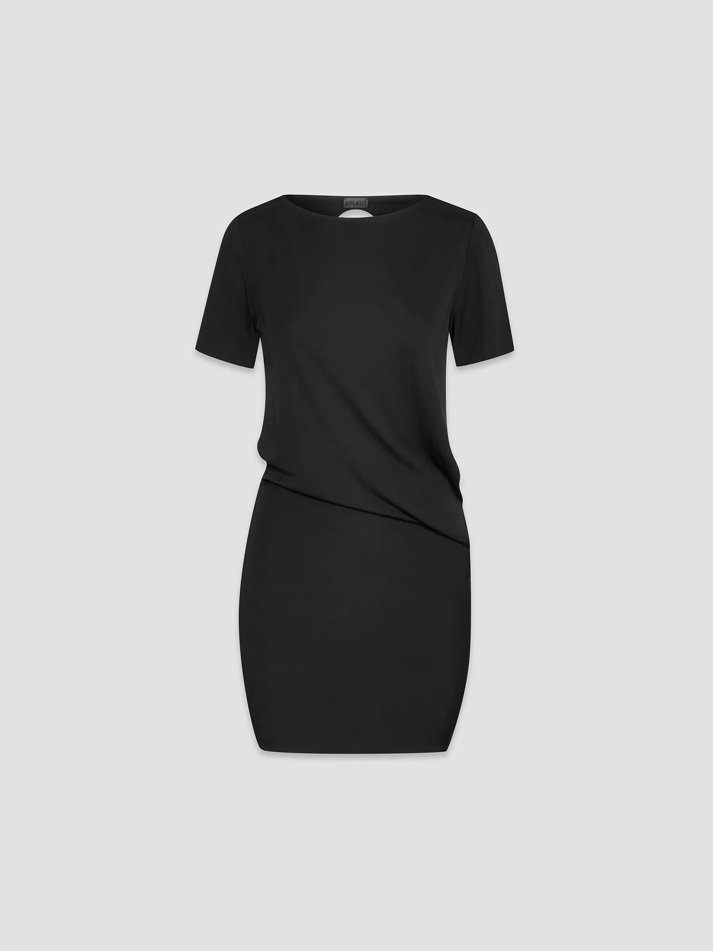 An open back, short sleeve mini dress in double-layer lustre viscose jersey. The fit is loose and slinky through the body and sleeves, and closer through the hips. Asymmetric draped detailing at the front and lower back complete the silhouette.