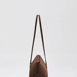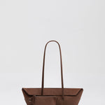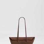 Form and function combines with this mini suede tote bag. Designed with sculptural folds and peaks, its minimal flap opening can be tucked in to reveal an embossed custom logo.