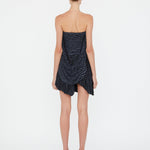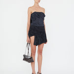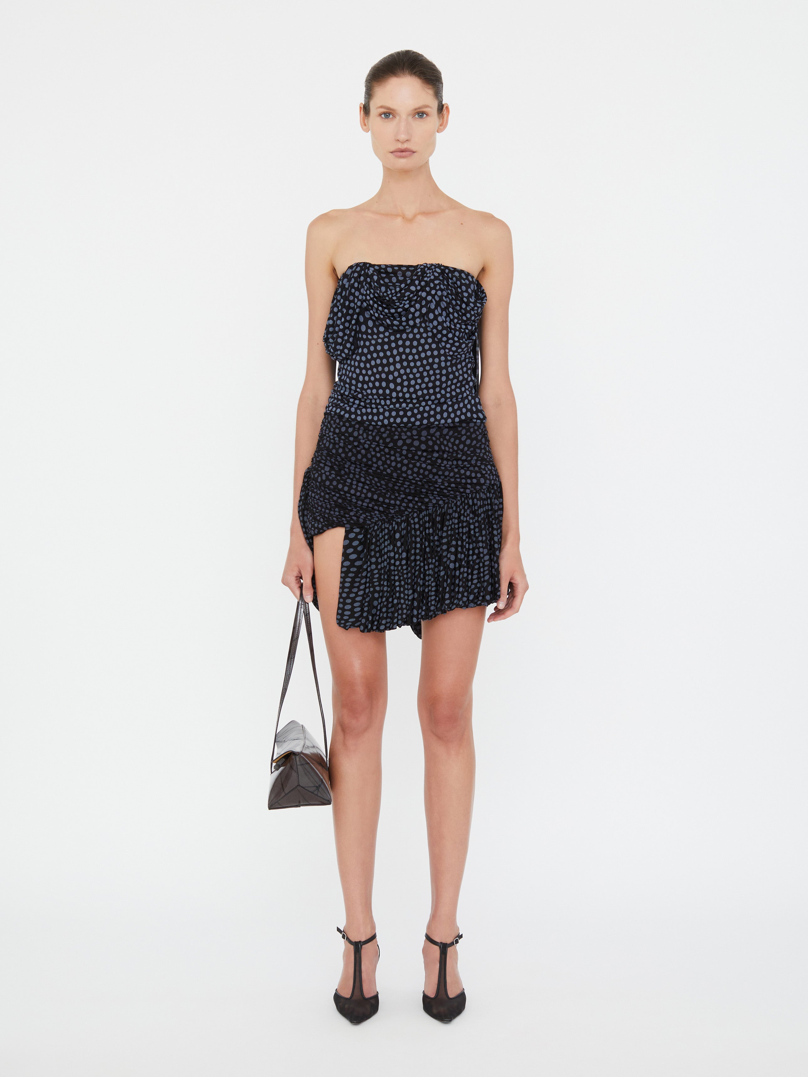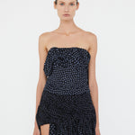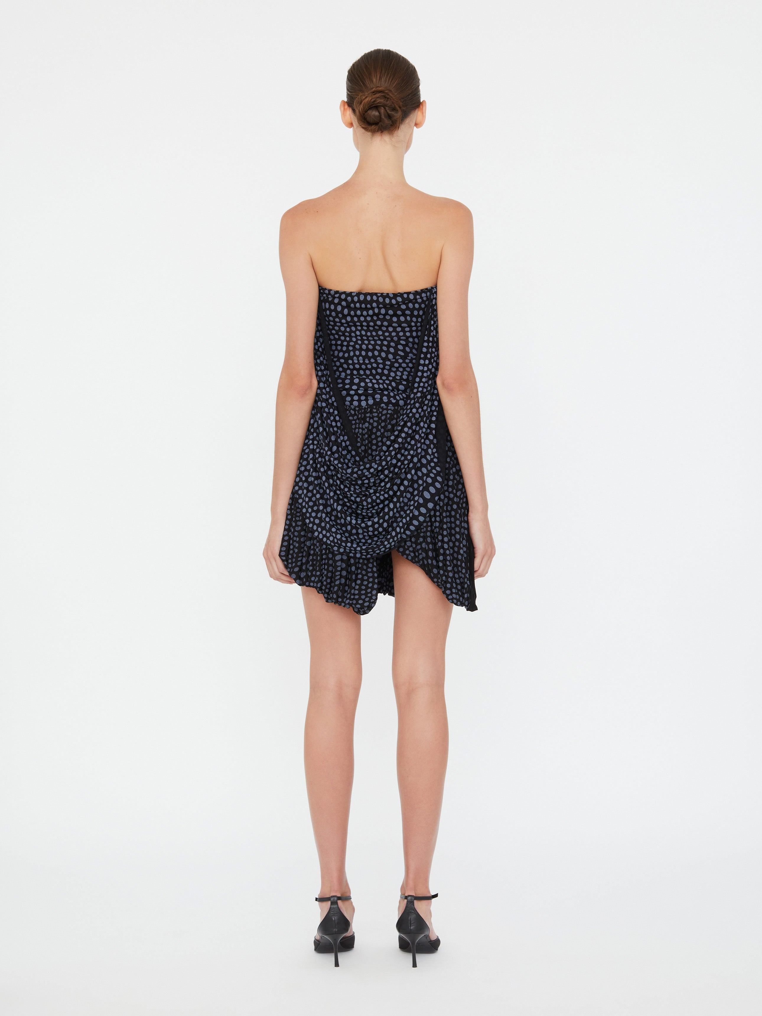 Blue on black warped polka dot print channels low-tech 90s and the subtle chaos of a summer rain shower. Warped dot print is gathered, tucked and cinched to distortion in these lavishly draped mini skirt. Cascading drapes amplify dimension and movement.