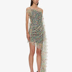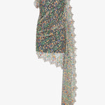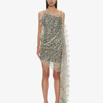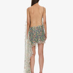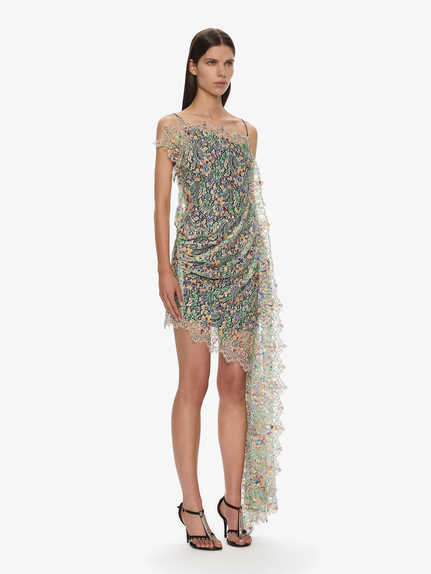 A sculpted mini dress crafted in hand-painted French lace, draped asymmetrically across the body with soft gathering. Finished with a scalloped hem and elongated lace panel that trails from the shoulder, the silhouette merges artisanal craft with fluid sensuality.