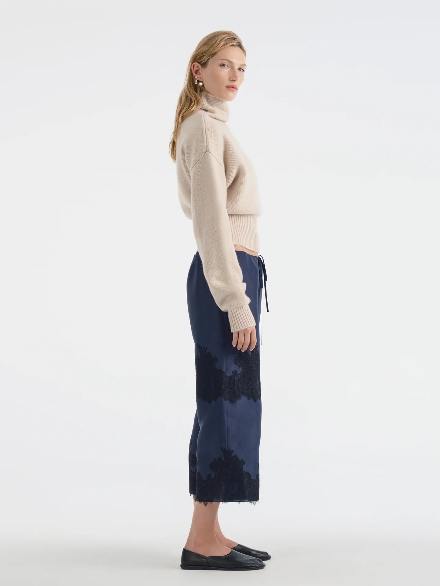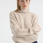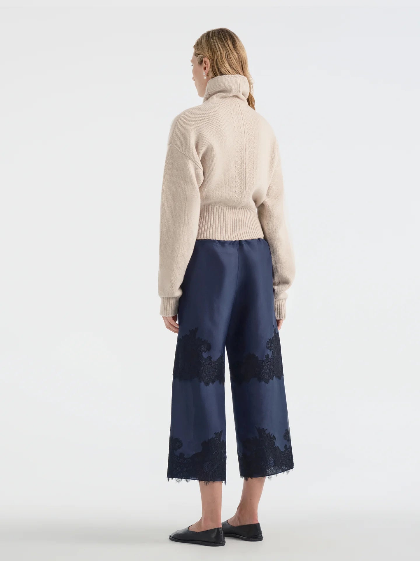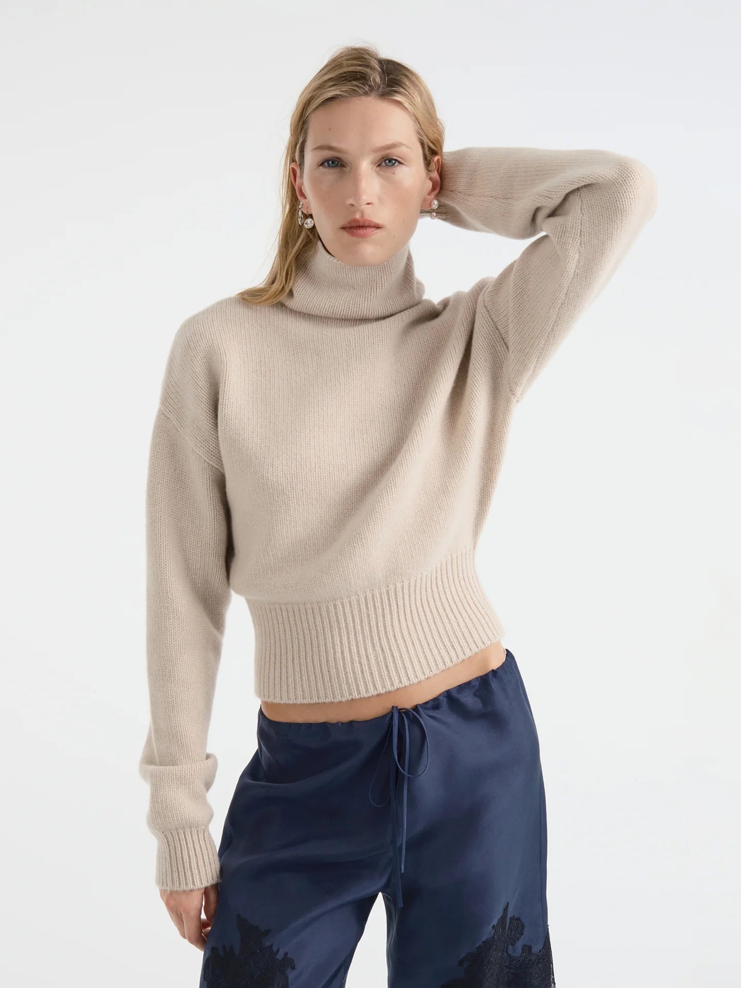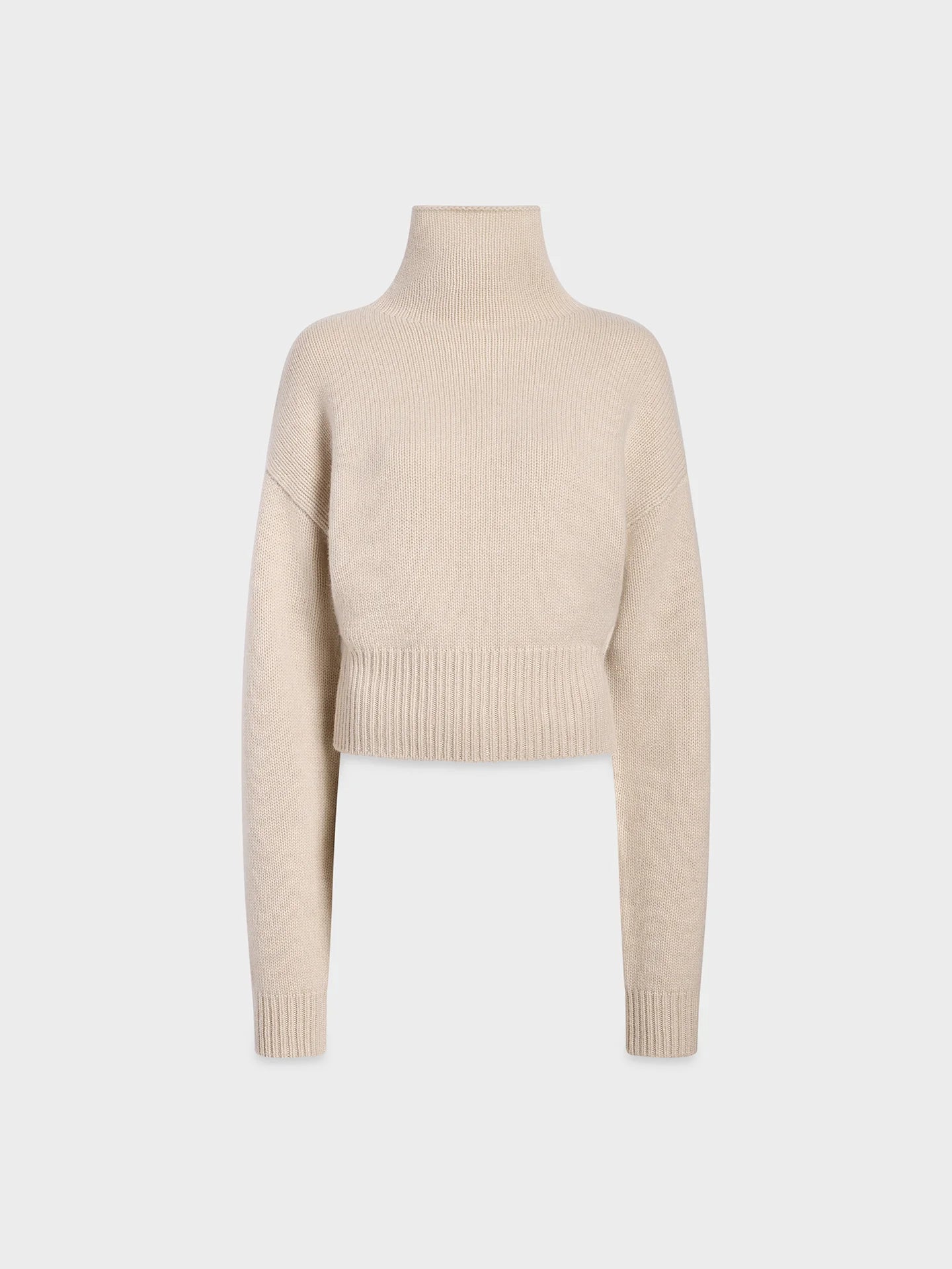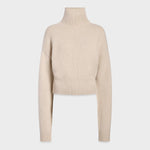 Medium weight cropped cashmere sweater with a funnel neck, dropped sleeve, and tapered hem for a blousant fit through the body. Finished with rib detailing at the hem and cuffs, and a reverse seam detail at the center back.
