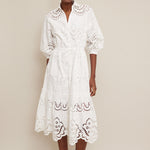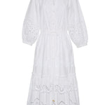 Embroidered cotton poplin. Collared neckline. Drawstring waist. Puffed sleeves. Midi hemline. Unlined. Front placket opening. Functional drawstring waistband. Sized for an easy fit.