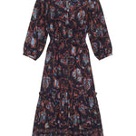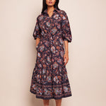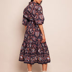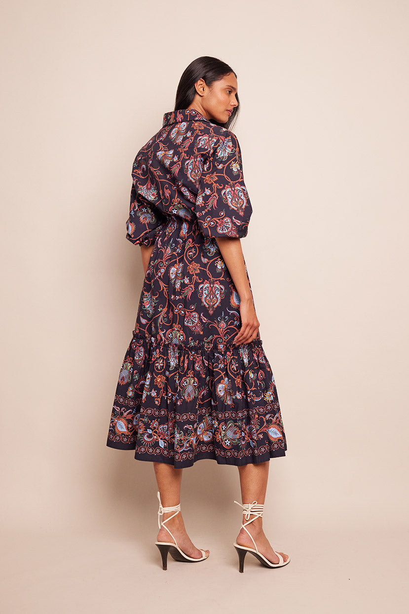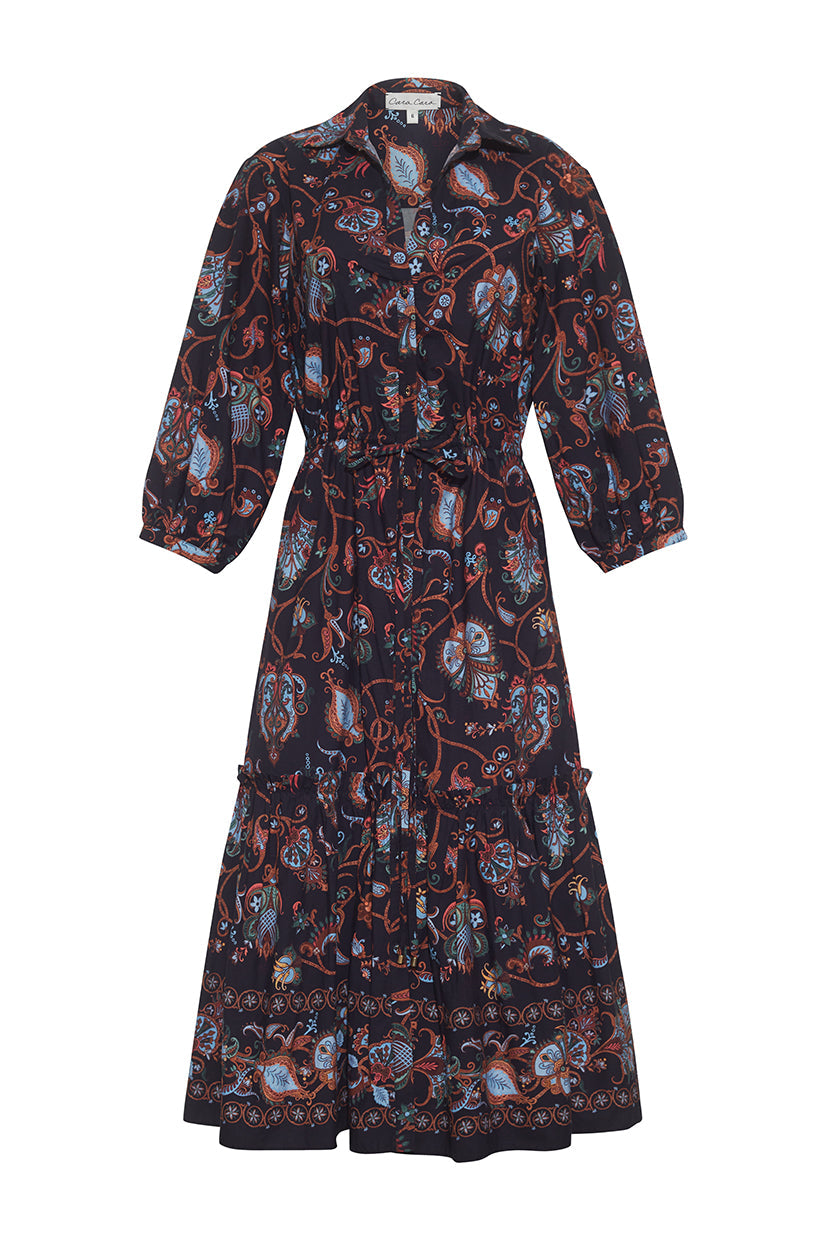 Collared neckline. Drawstring waist. Puffed sleeves. Midi hemline. Unlined. Buttons and drawstring waistband. Placed print at hem.