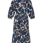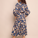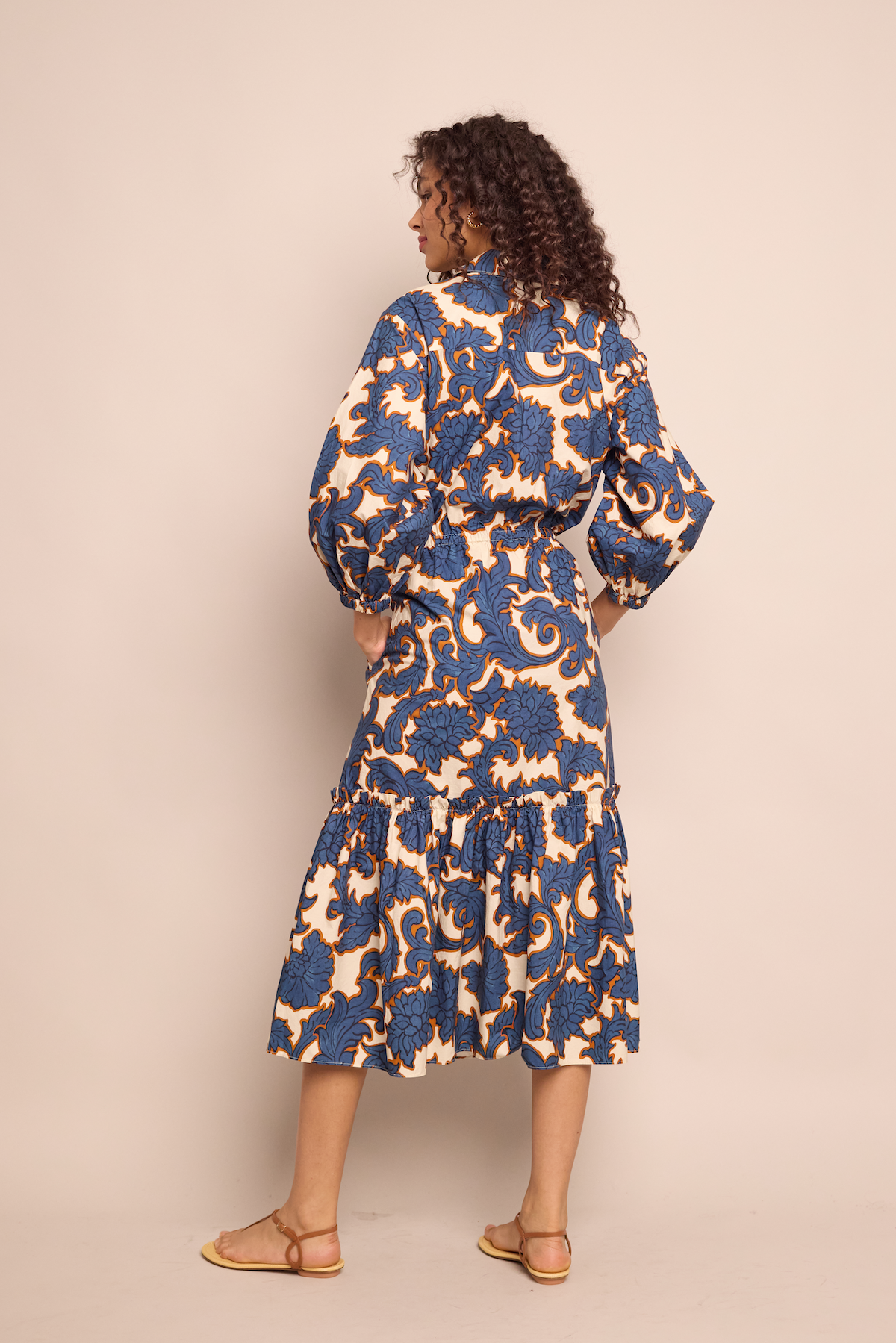 Collared neckline. Drawstring waist. Puffed sleeves. Midi hemline. Unlined. Buttons and drawstring waistband. Allover print.