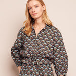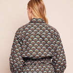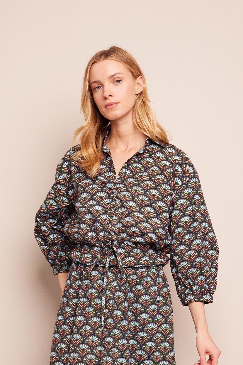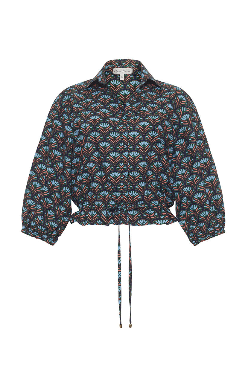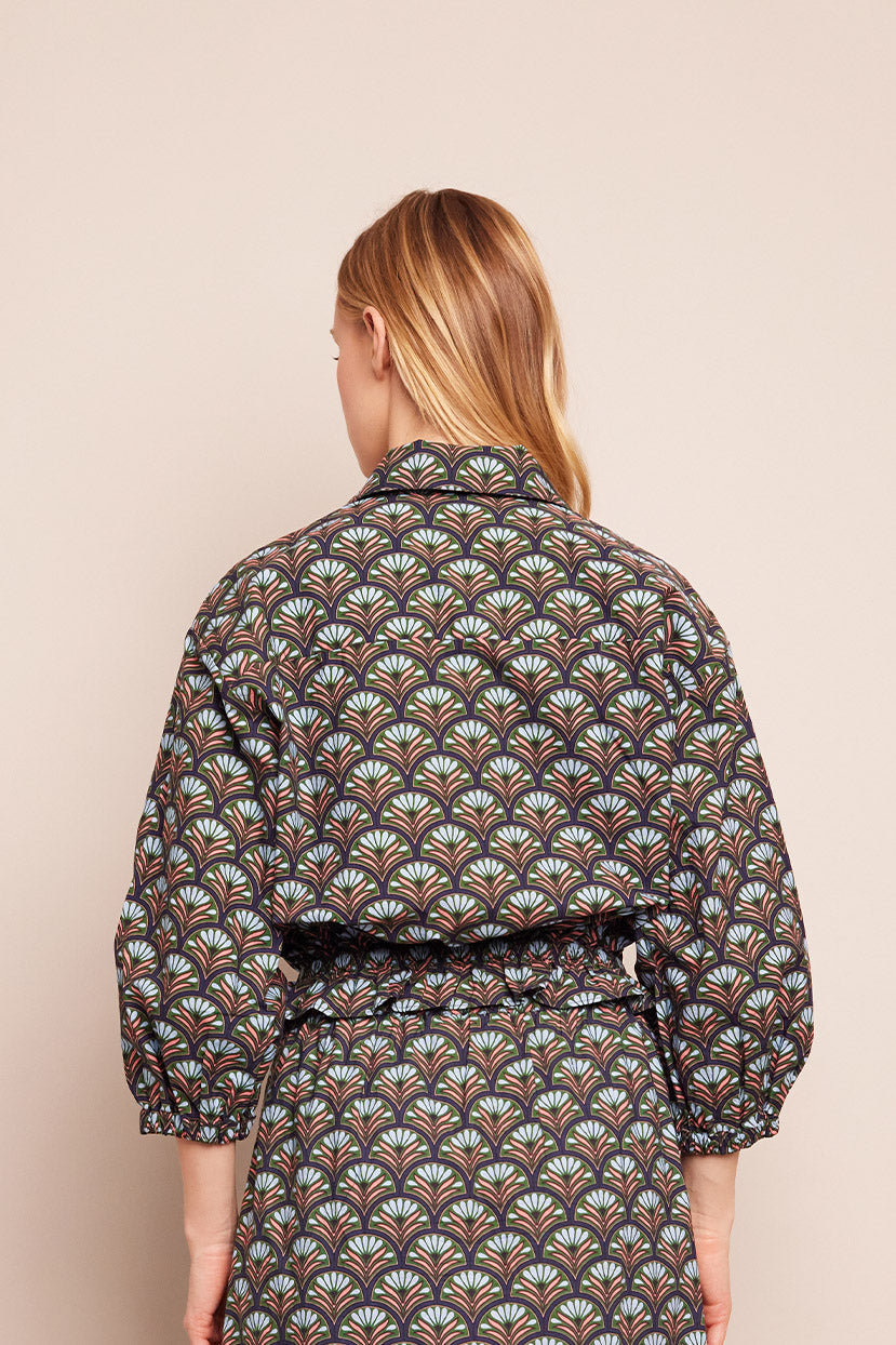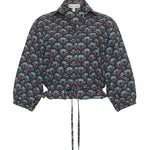 Drawstring hemline, cropped silhouette, covered buttons. Allover print.