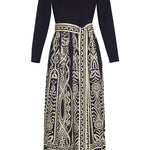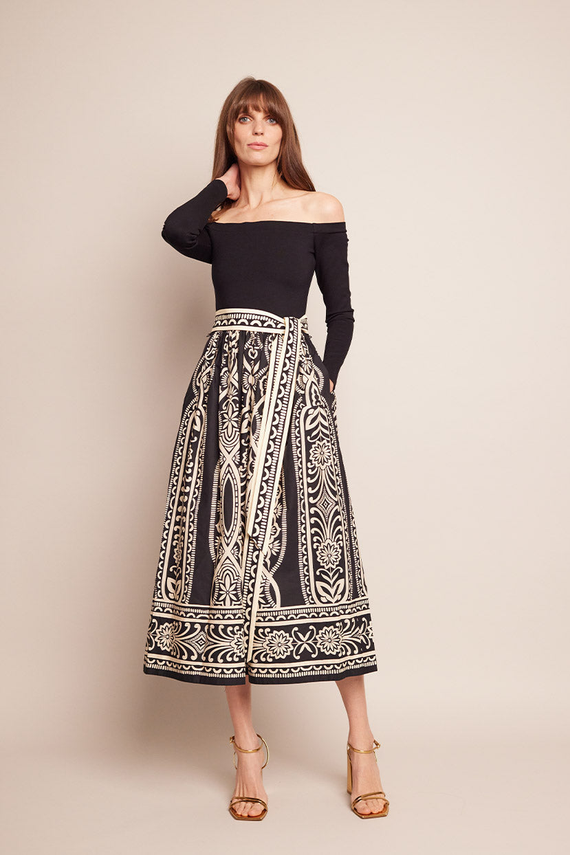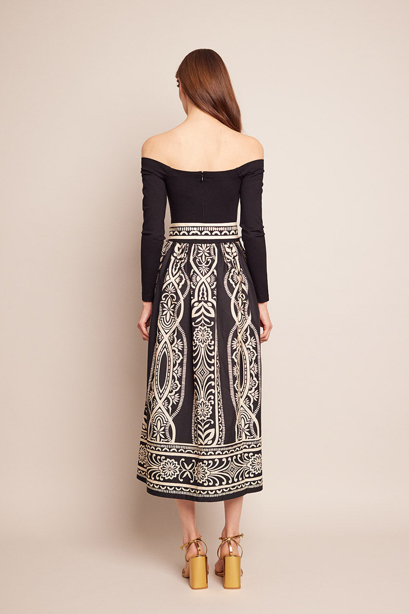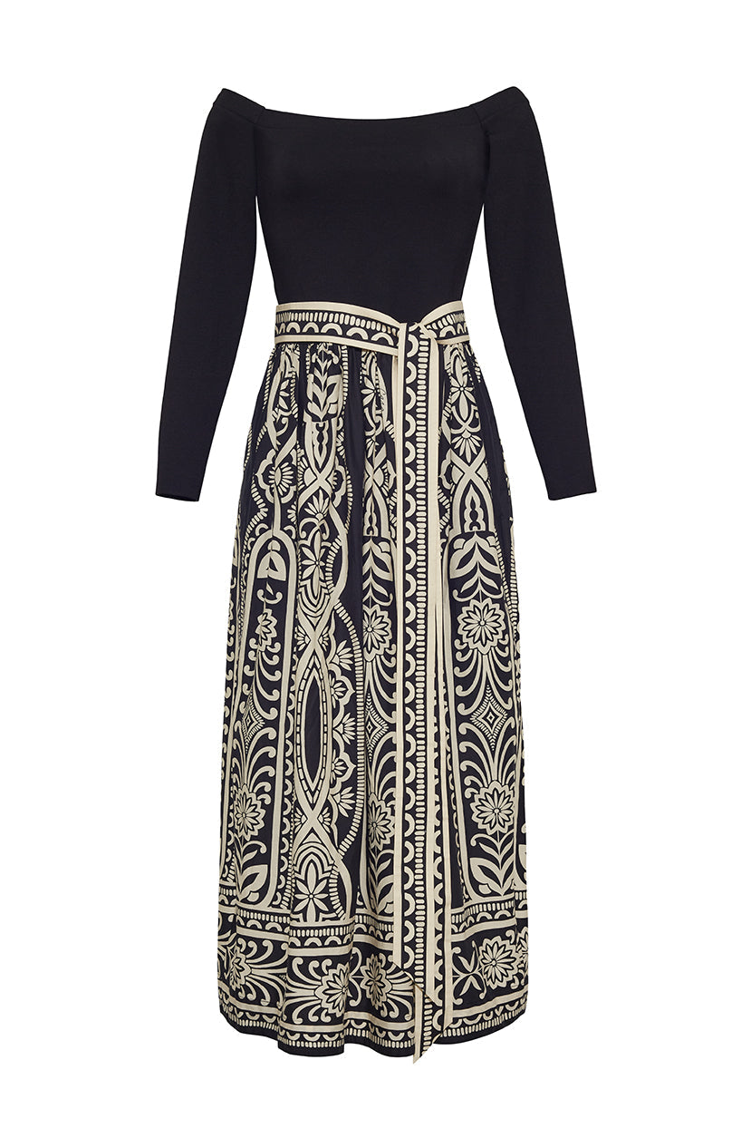 • Off-the-shoulder, long-sleeve ponte poplin midi dress designed for fit-and-flare look
