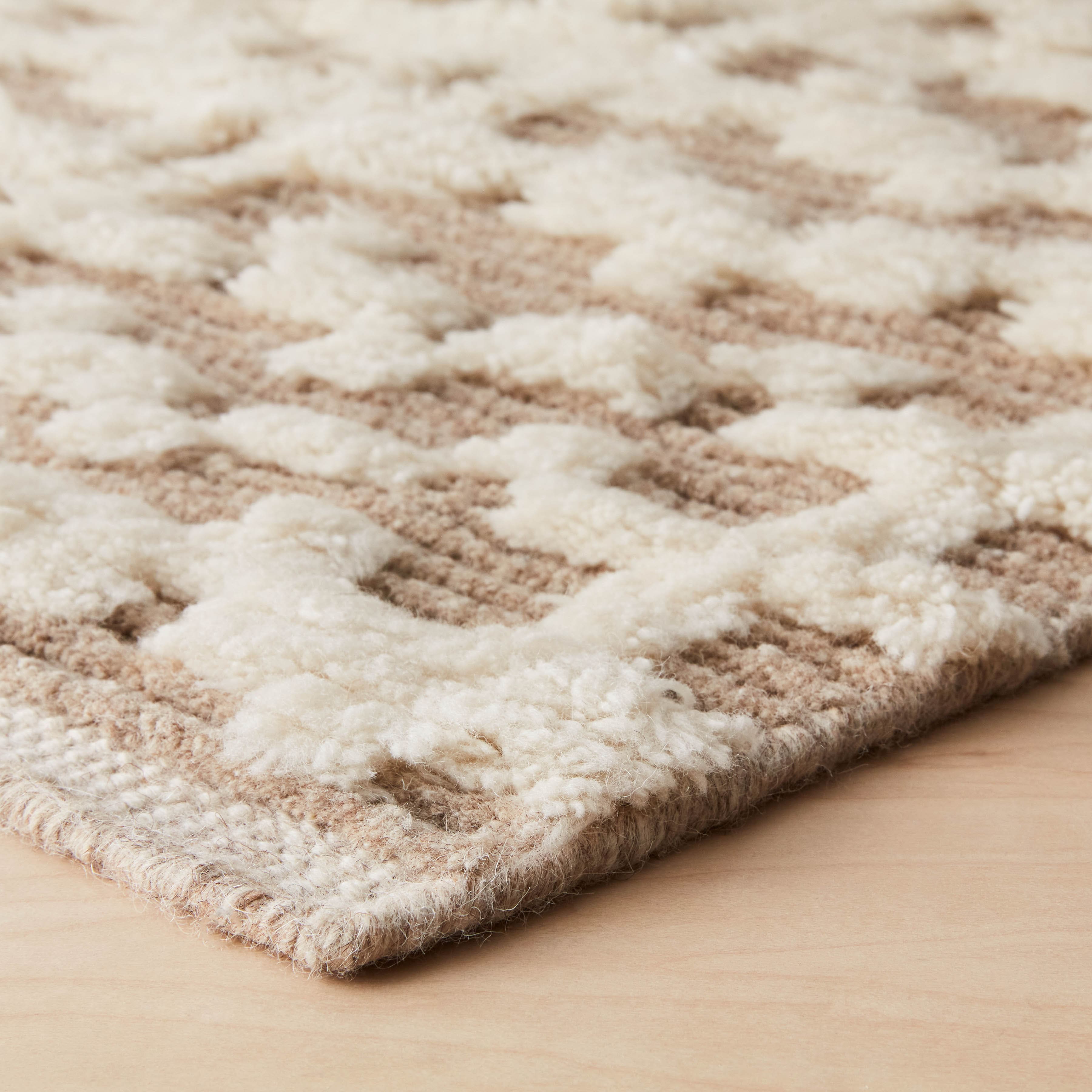 The subtle centerpiece your space needs, this hand-knotted area rug has range. Rich wool in neutral shades of taupe and ecru is hand-knotted into a plush, high-low pile, accented with a graphic zig-zag pattern that always makes an impression. Perfect for a family room or bedroom, this beautiful area rug adds a touch of modern comfort wherever it lands.
