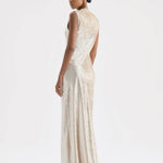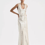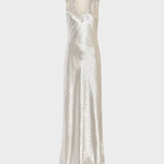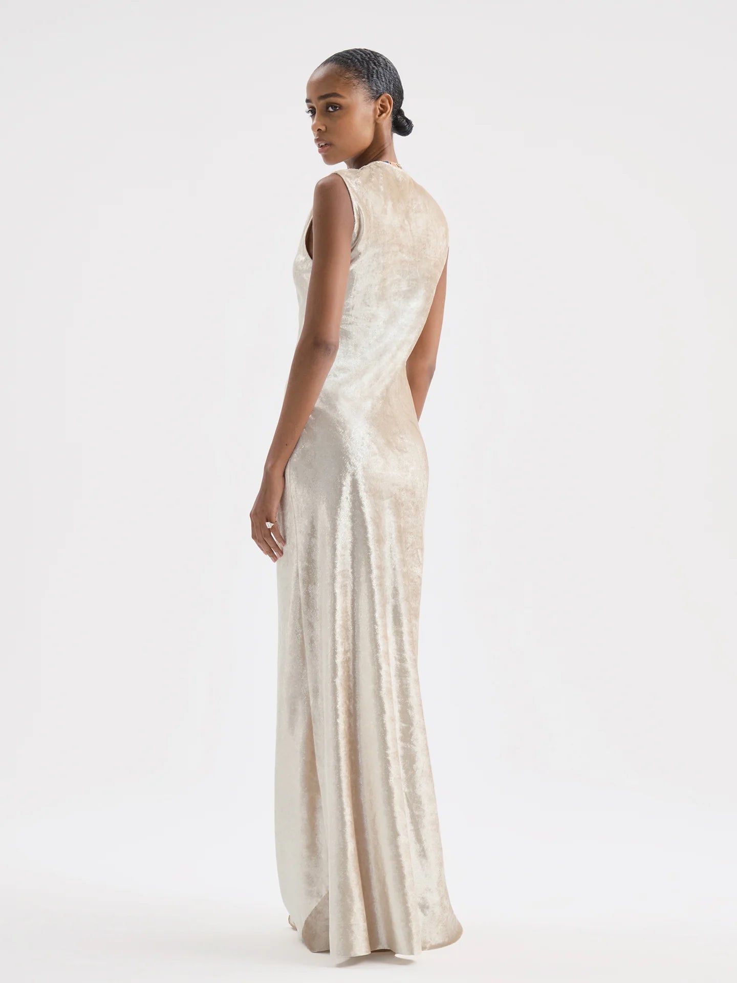 Bias-cut gown with a deep scoop neckline, wide tank shape, and a floor-length hem. Crafted in soft and fluid lurex velvet from Spain, lending a rich texture and liquid drape that moves with the body.