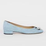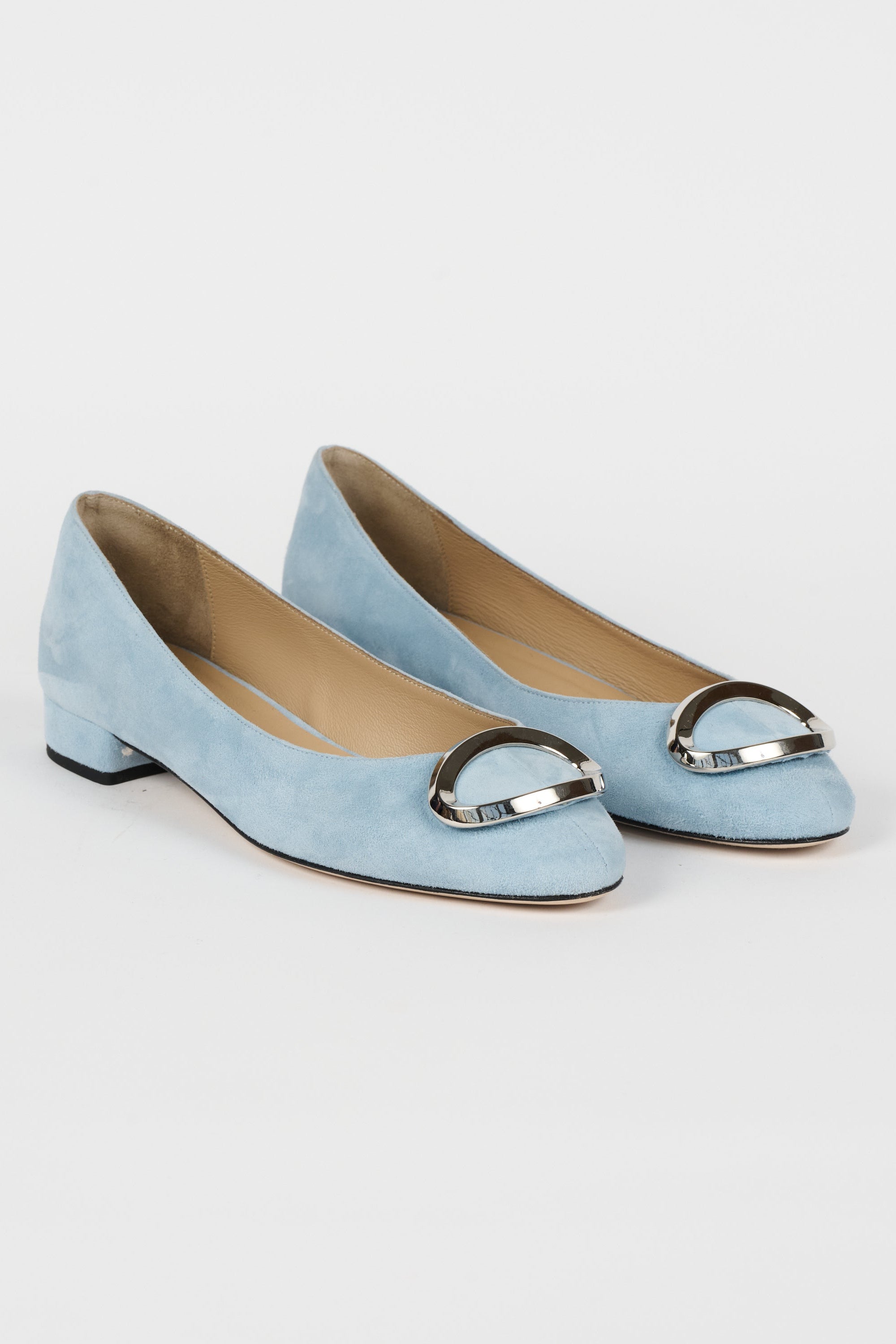 A new toe, soft and demur but cool. A low vamp and lady heel. Italian beautiful brass hardware in an organic oval. Handmade in Italian Suede with lamb lining.