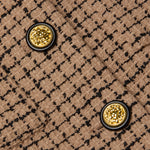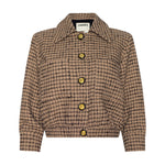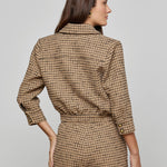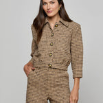 A ladylike, three-quarter sleeve jacket crafted from a textured tan tweed woven with a black windowpane grid. Wear the Jia as a top or second layer.