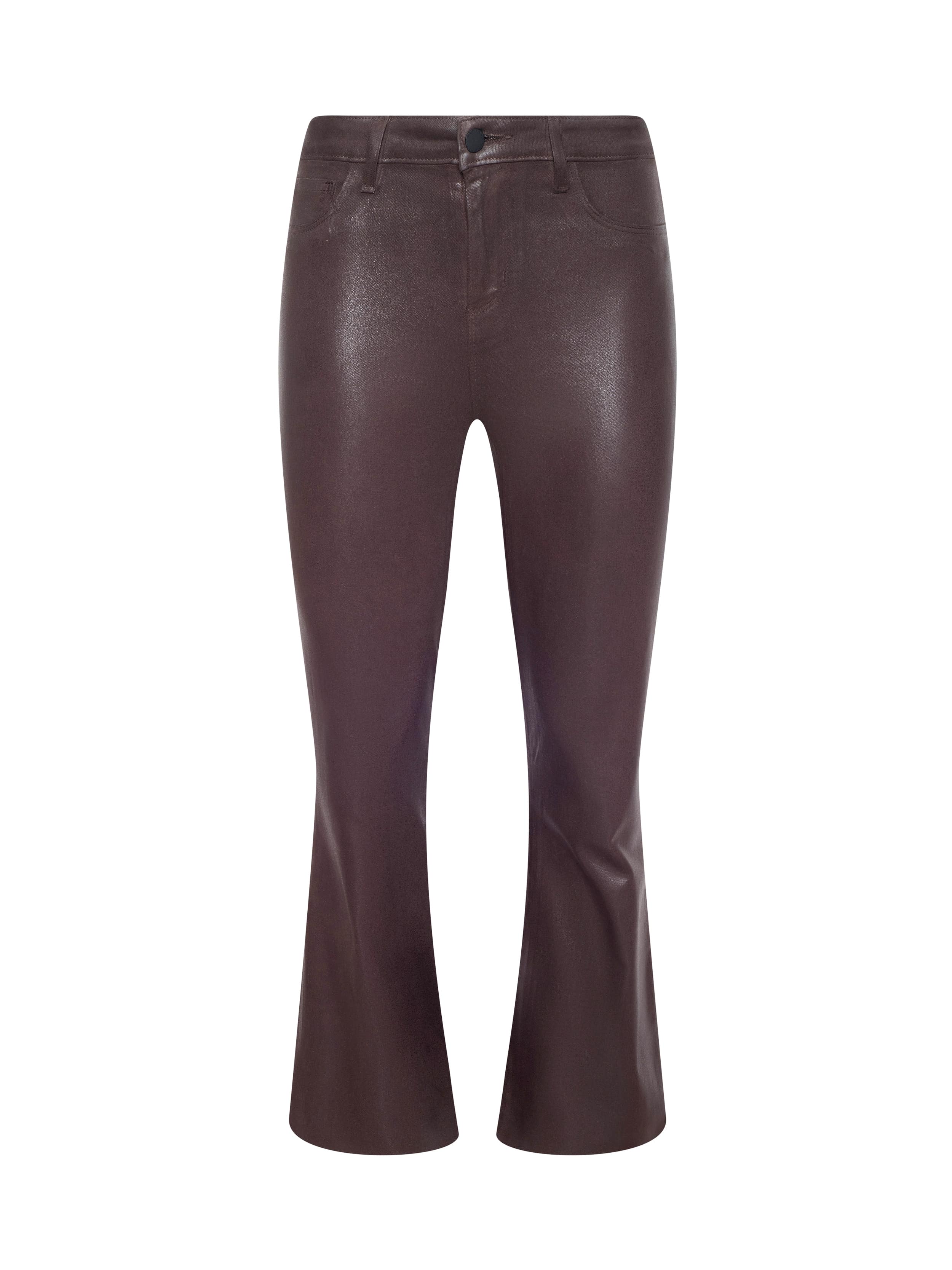 The perfect wear-now cropped flare jean, designed to be compatible with flats or heels. This beautifully proportioned kick flare is now back in chocolate brown leather-alternative coated denim.