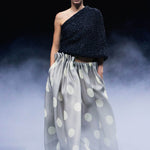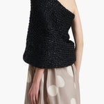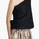 A hand-knit top of artful asymmetry and rich tactility. Cotton chain yarns interlaced with merino and raffia for a mélange of tones and textures. Slips on to create angular neckline, revealing a bare shoulder and arm.