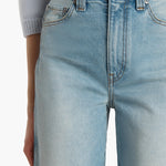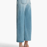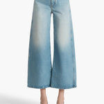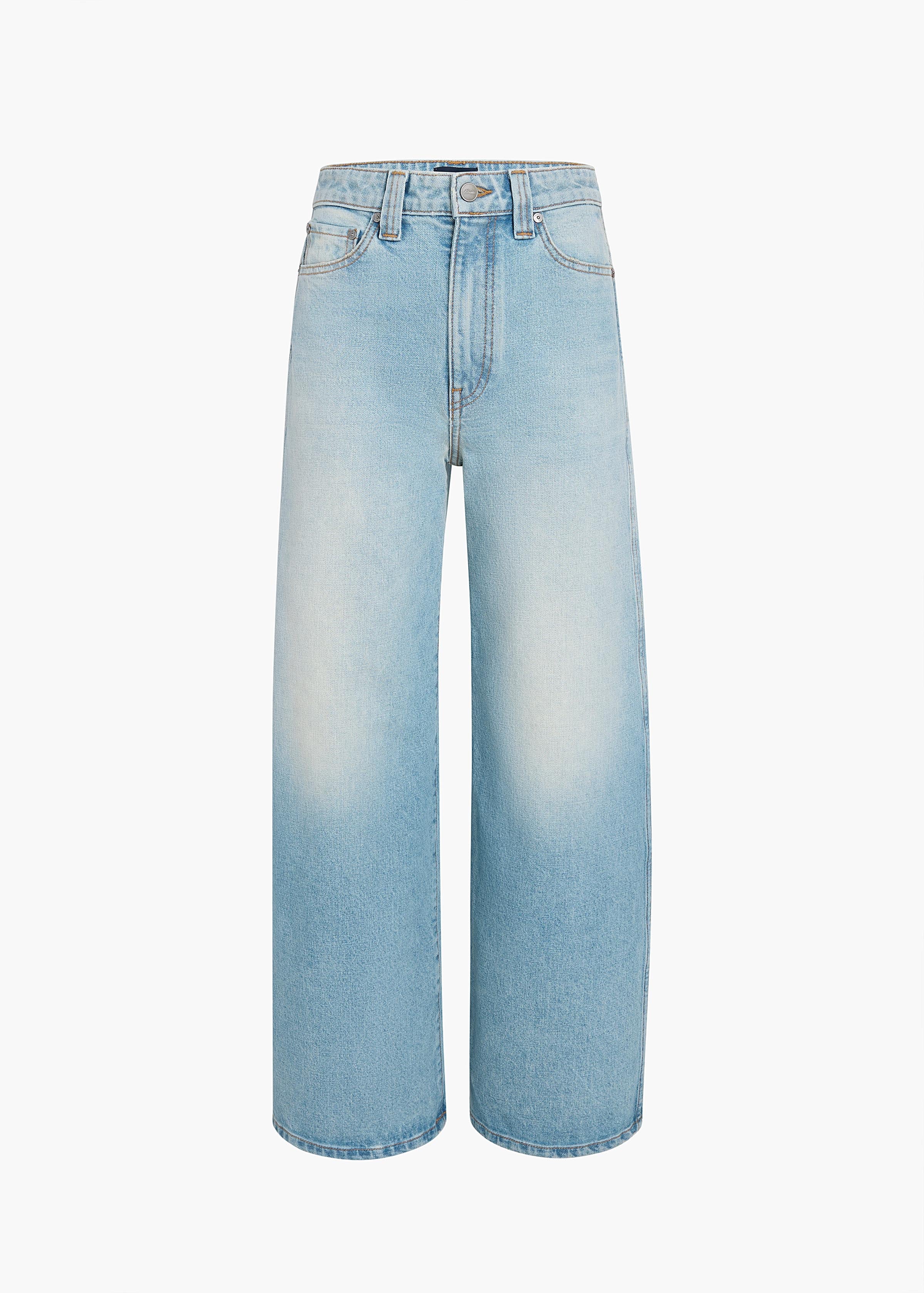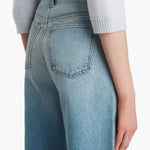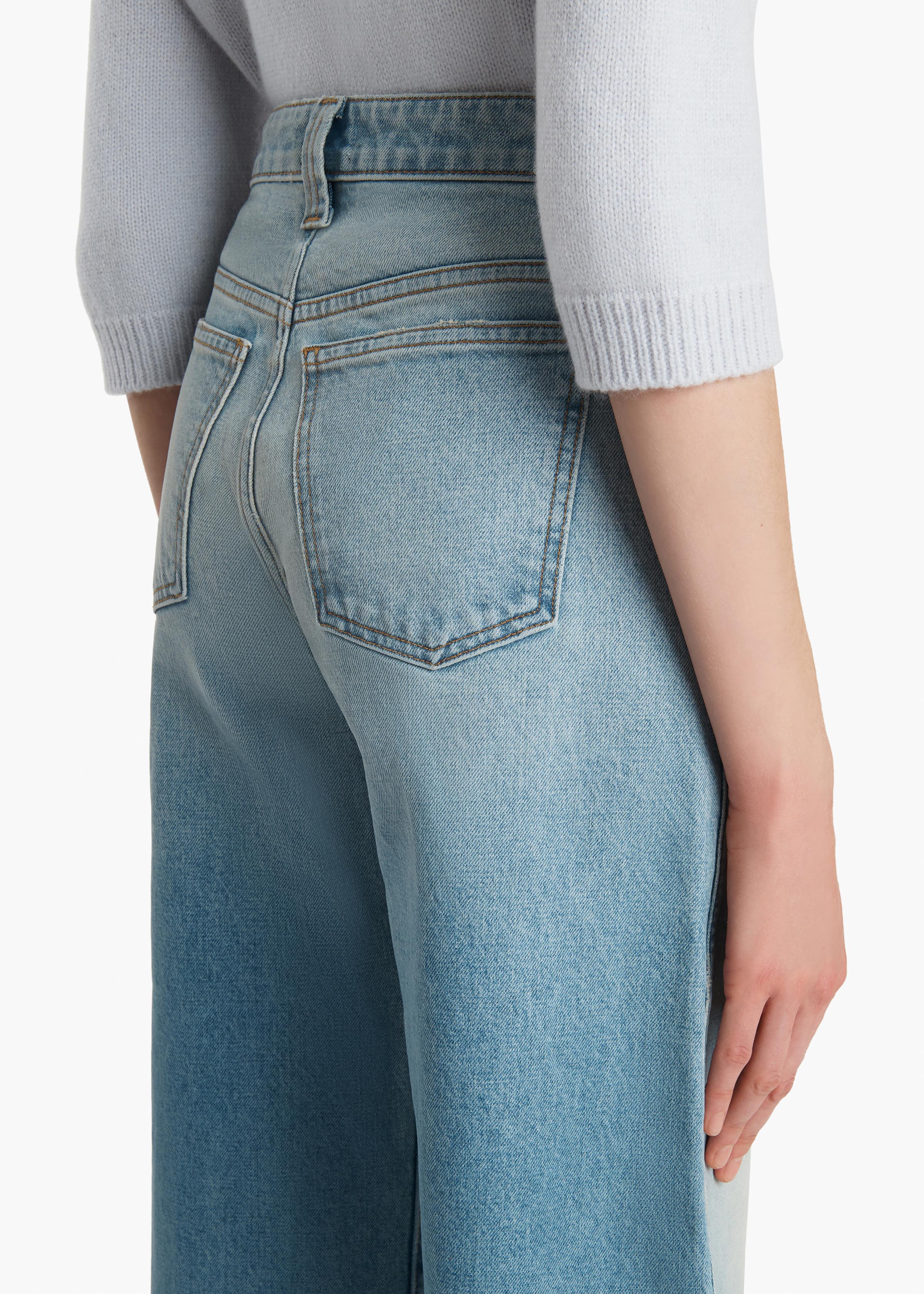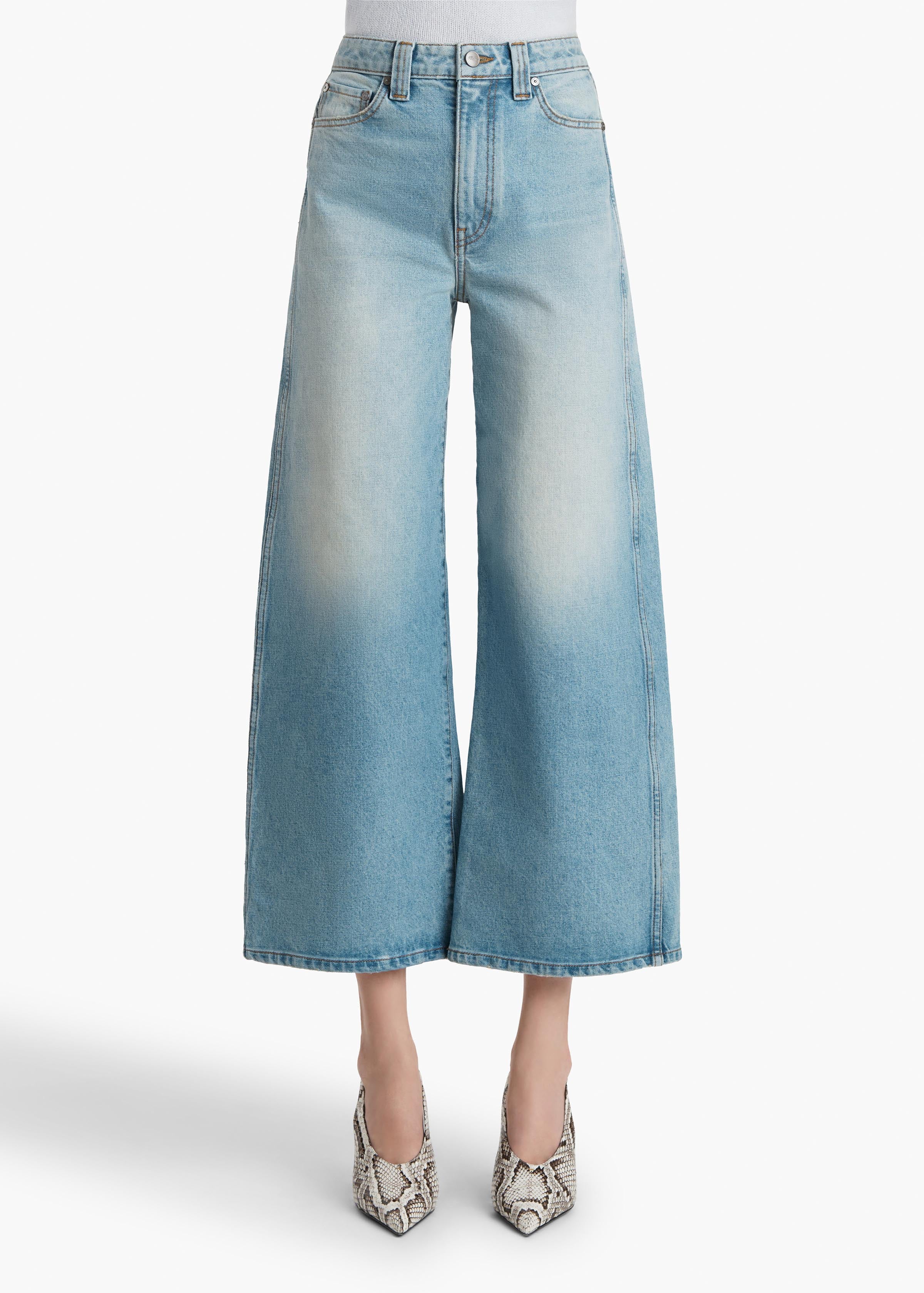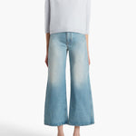 Combining the elegance and ease of wide-leg trousers with the dynamism of a cropped length, this high-waisted, five-pocket silhouette flares gently below the knee. Hand-finished with signature button of antiqued nickel.