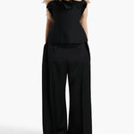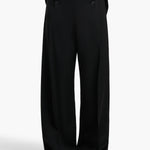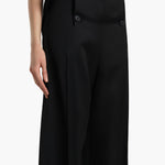 A reimagined sailor pant tailored in satin selected for its dramatic drape and luminous sheen. The silhouette gains alluring dimension from a folded panel that extends laterally from the side seam. Secured by paired horn buttons at the clean front, with welt pockets at back. Lined in soft silk habotai.