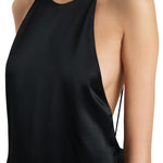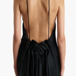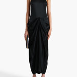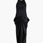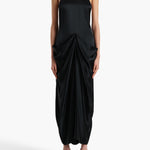 A dynamically draped dress in luminous satin selected for its lightweight softness with enduring structure. Framed by a halter neckline balanced by an exposed back, the fluid silhouette is animated by a sculpted bustle. Concealed zipper closure at side. Lined in soft silk habotai.