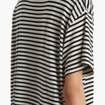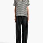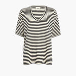 An easy-fitting v-neck t-shirt with an alluring edge in high-contrast stripes. Cut from cashmere-softened cotton jersey selected for its dry, washed texture and fluid drape. The relaxed silhouette is refined by ladder stitching along the short sleeves and hem. Slips on.