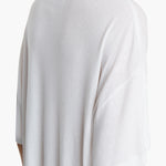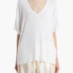 An easy-fitting v-neck t-shirt with an alluring edge. Cut from cashmere-softened cotton jersey selected for its dry, washed texture and fluid drape. The relaxed silhouette is refined by ladder stitching along the short sleeves and hem. Slips on.