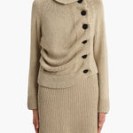 A fluid and sculptural cardigan in a blend of silk and cotton. The draped collar and placket introduce striking asymmetry, creating soft gatherings and a dynamic hem. Refined by contrast haircalf buttons and 1x1 ribbing.