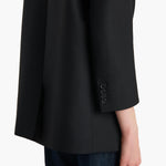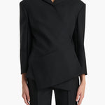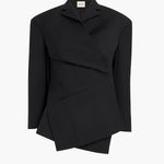 A striking jacket defined by artful, angular layers. Tailored in sculptural cady selected for its rich texture, beautiful drape, and silken luster. The twisted wrap-front silhouette is framed by a compact notched collar, with extended and forward-sitting shoulders, cropped sleeves, and a central seam at back. Secured by hook closure at contoured waist. Lined in silky cupro twill.