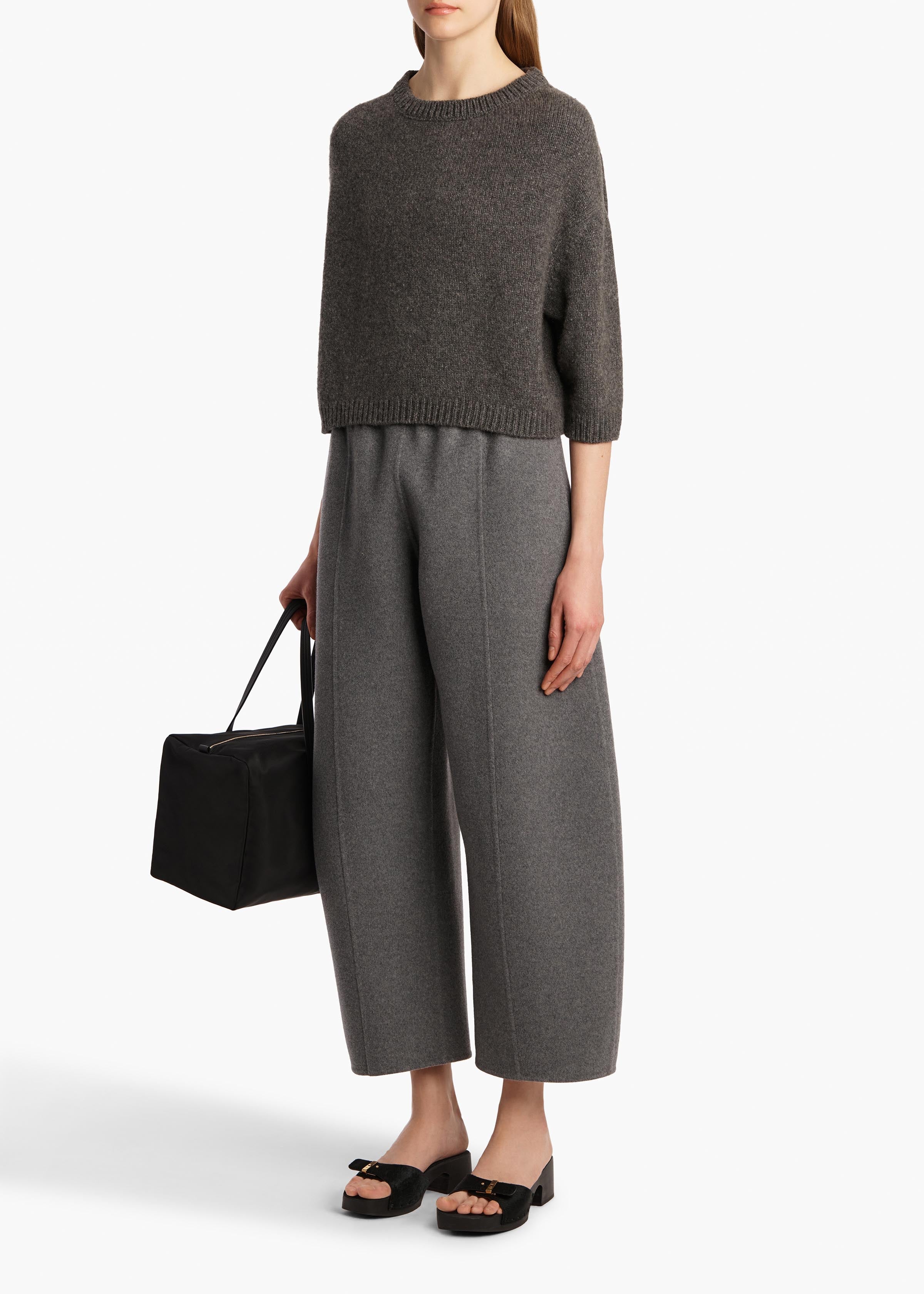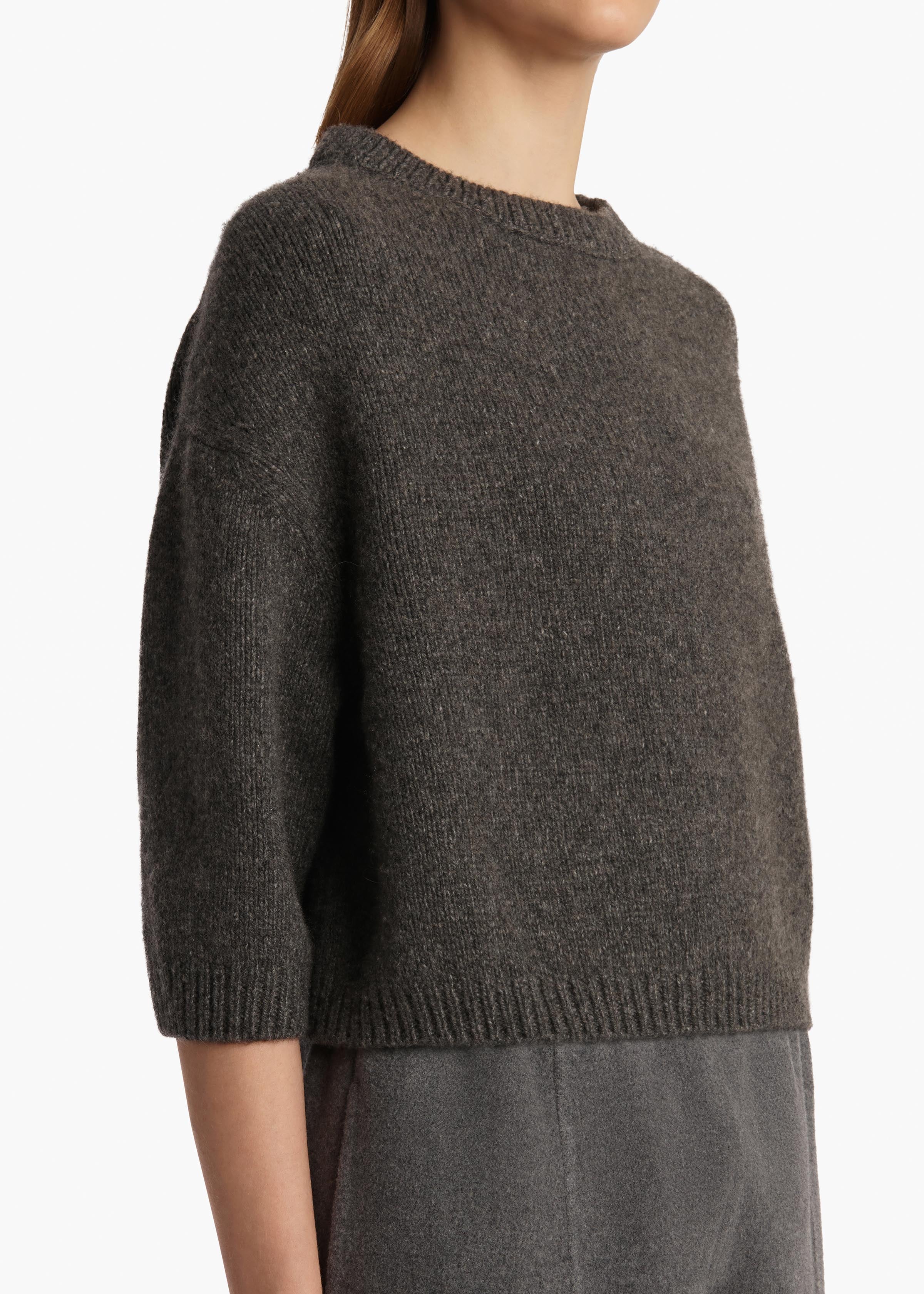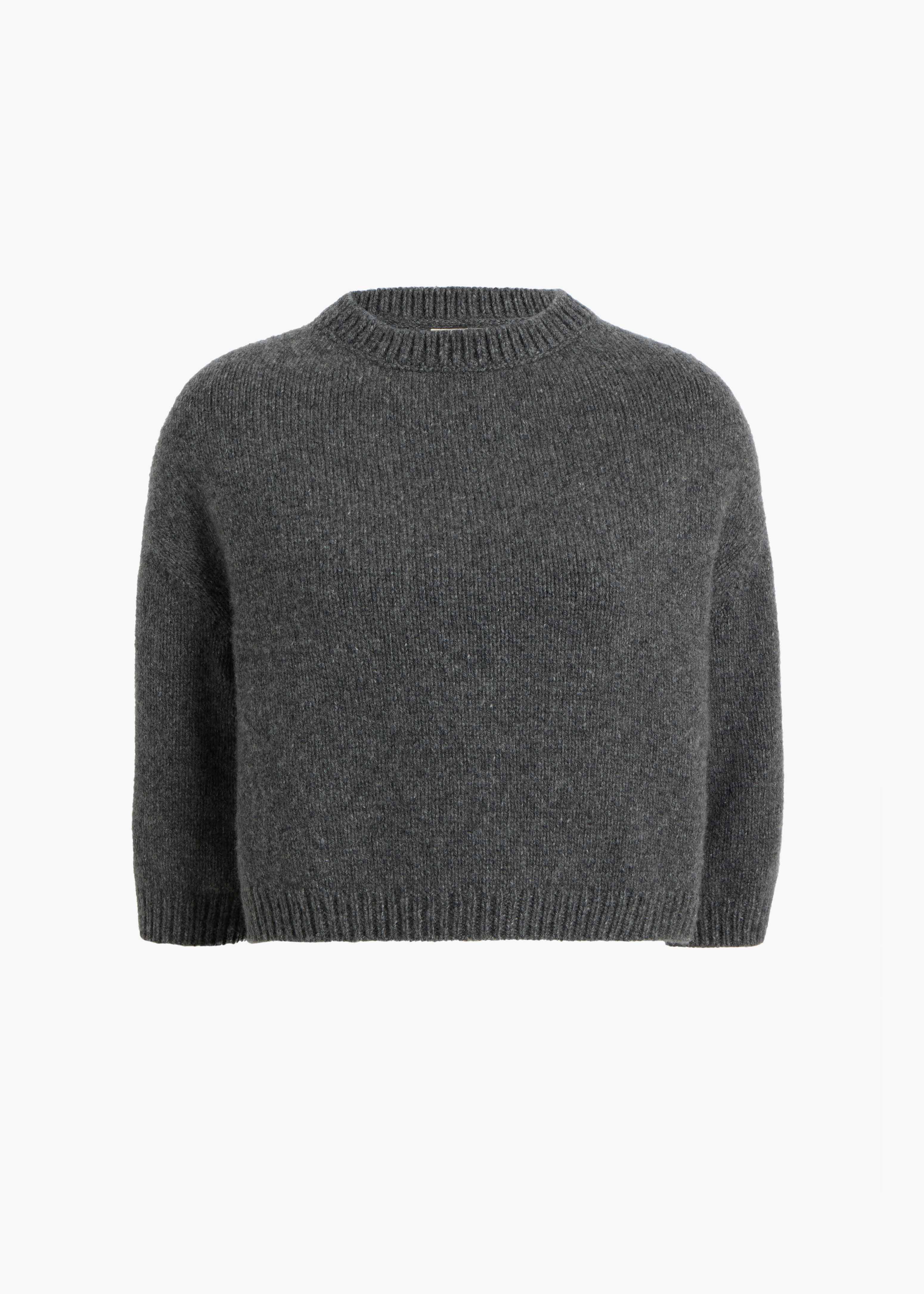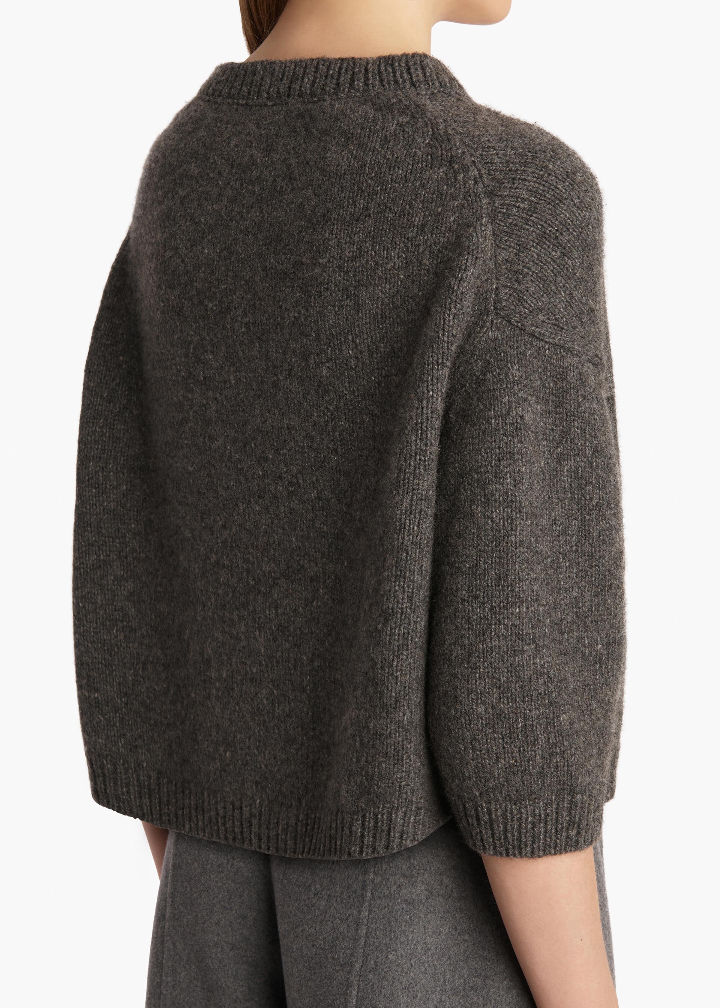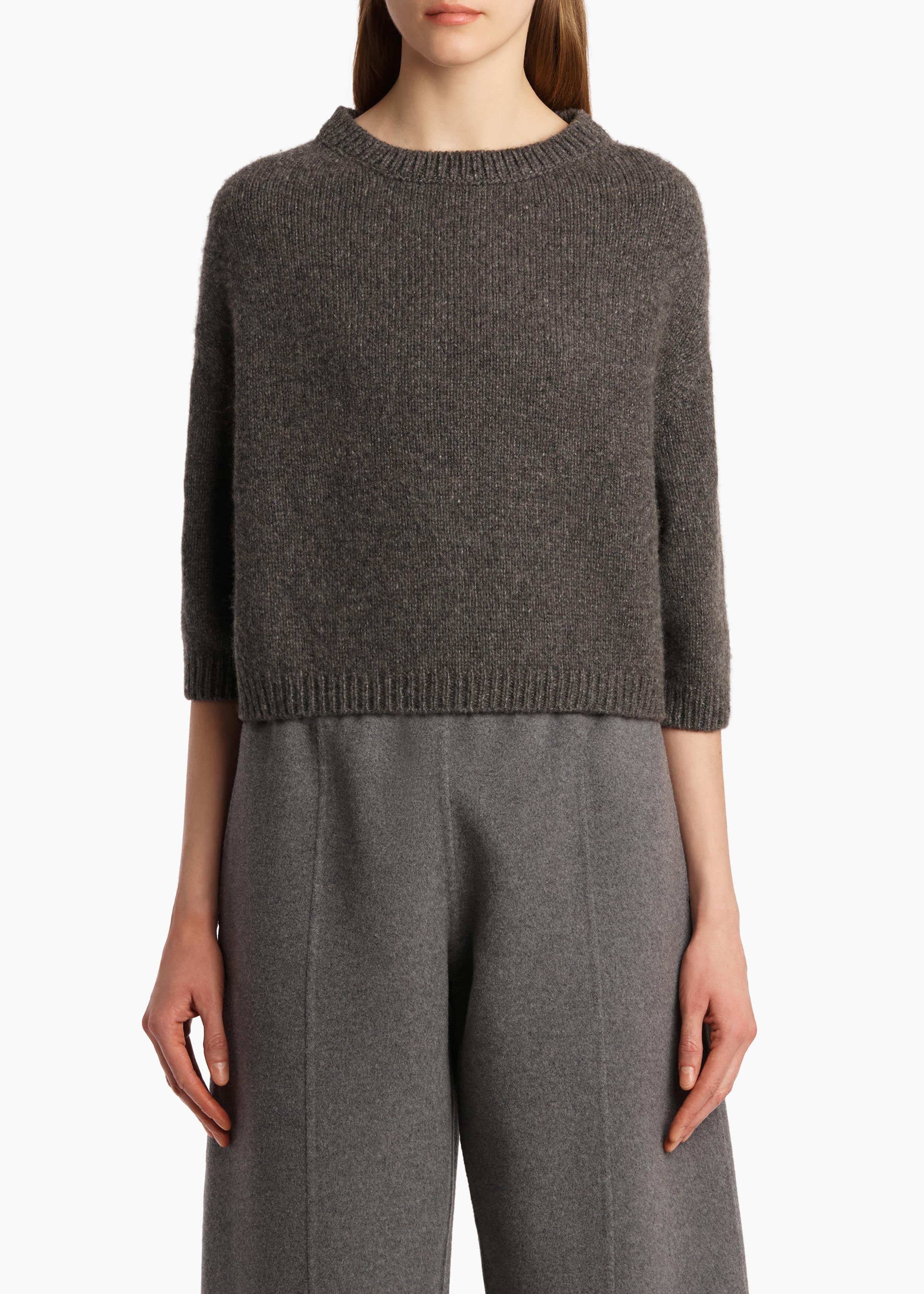 A softly shaped pullover designed to highlight the softness and structure of luscious cashmere. Dropped shoulder seams enhance the unique, deliberately rounded silhouette. Refined by ribbing at wide crewneck, elbow-length sleeves, and hem. Slips on.