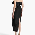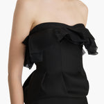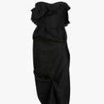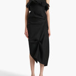 A dynamically deconstructed dress in sculptural cady selected for its rich texture, beautiful drape, and silken luster. Underpinned by internal corseting at the bustier-style top, the fitted silhouette is animated by flourishes of draped panels, dimensional folds, and raw edges. Back slit at layered hem. Lined in soft silk habotai.