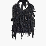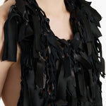 A hand-knit sleeveless top that combines artisan craftsmanship and rich tactility with exceptional lightness. Made in the USA with hand-cut strips of soft and supple plongé nappa lambskin that are transformed into a stunning new texture, forming a cropped halter-style silhouette animated by raw edges and fringe-like ends. Silk ties fasten at the back of the neck.