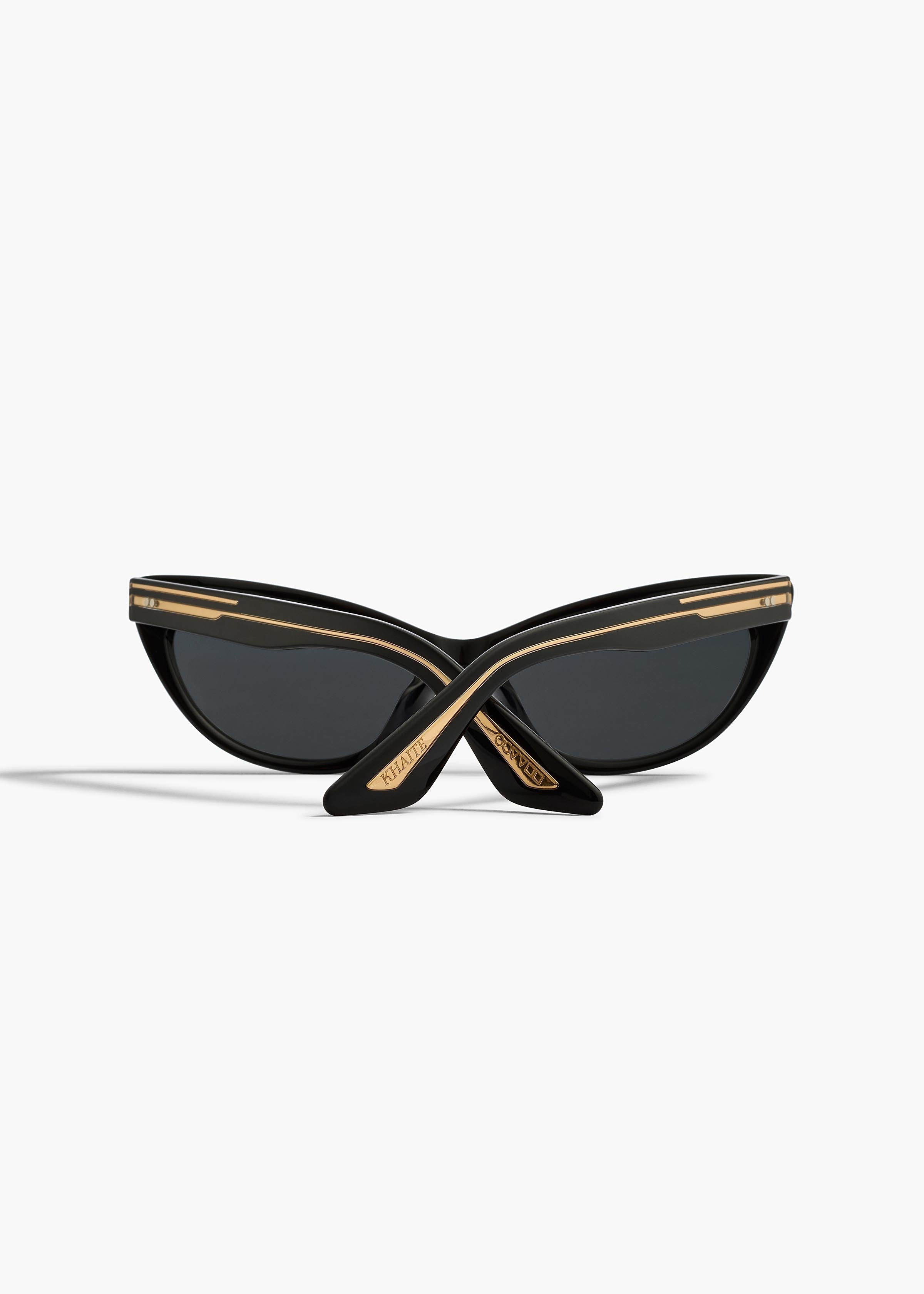 In collaboration with Oliver Peoples, the vision of KHAITE extends to eyewear. Handcrafted in Italy, these cat-eye sunglasses balance a strikingly upswept topline with scaled-down proportions for a refined look. Along the temples, a double-embedding process exposes custom corewire inspired by signature Empire hardware. Tipped with alternating logos, the temples also feature dual pins for enhanced strength and flexibility. Each pair includes a signature lipstick red case and a pouch that doubles as a lens cloth.