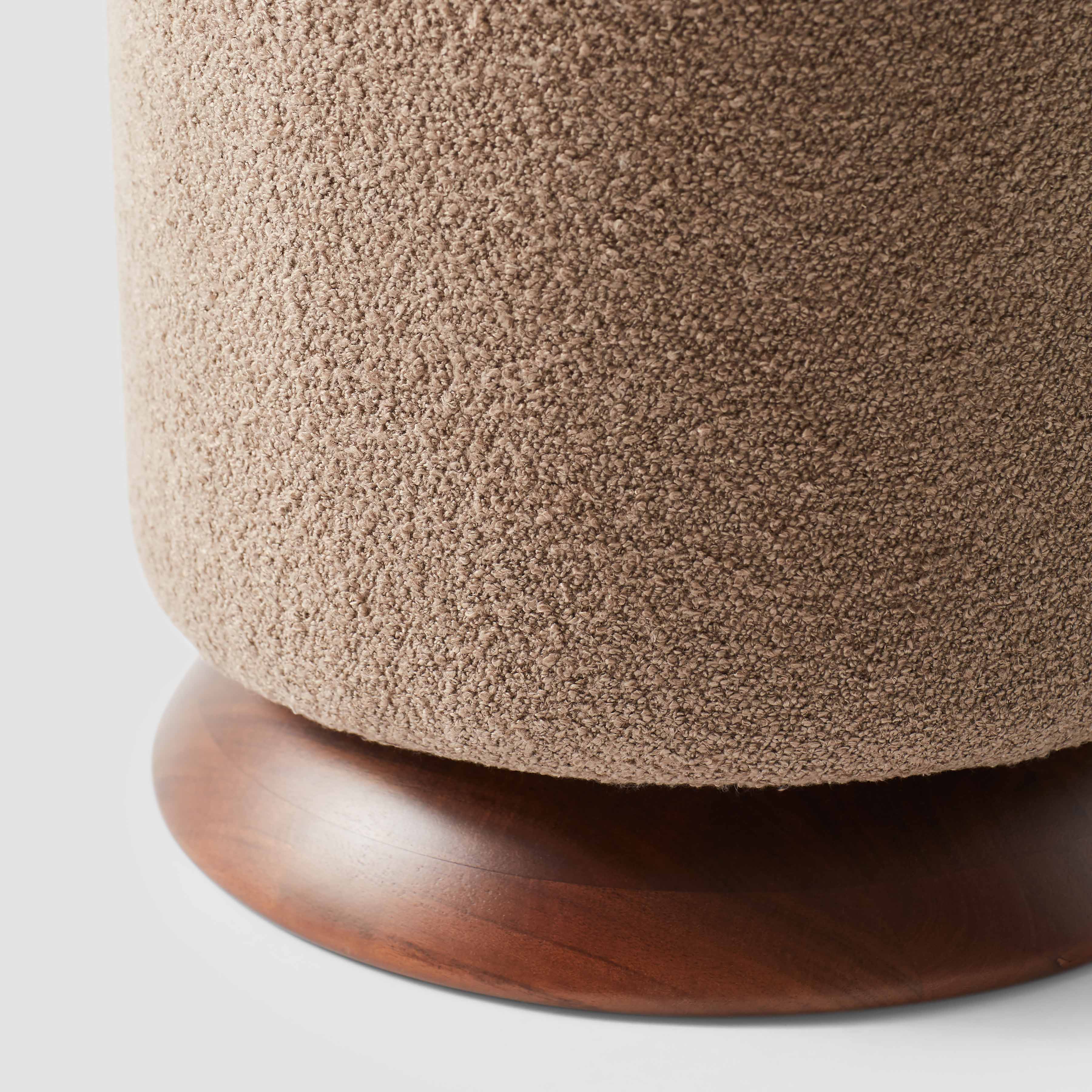 Rounded curves. Soft boucle textures. This handsome ottoman has range. From a cozy bit of extra seating to a landing pad for your new favorite book, it’s ready for anything. Framed in acacia with a durable performance fabric, each piece is the perfect place to put your feet up.