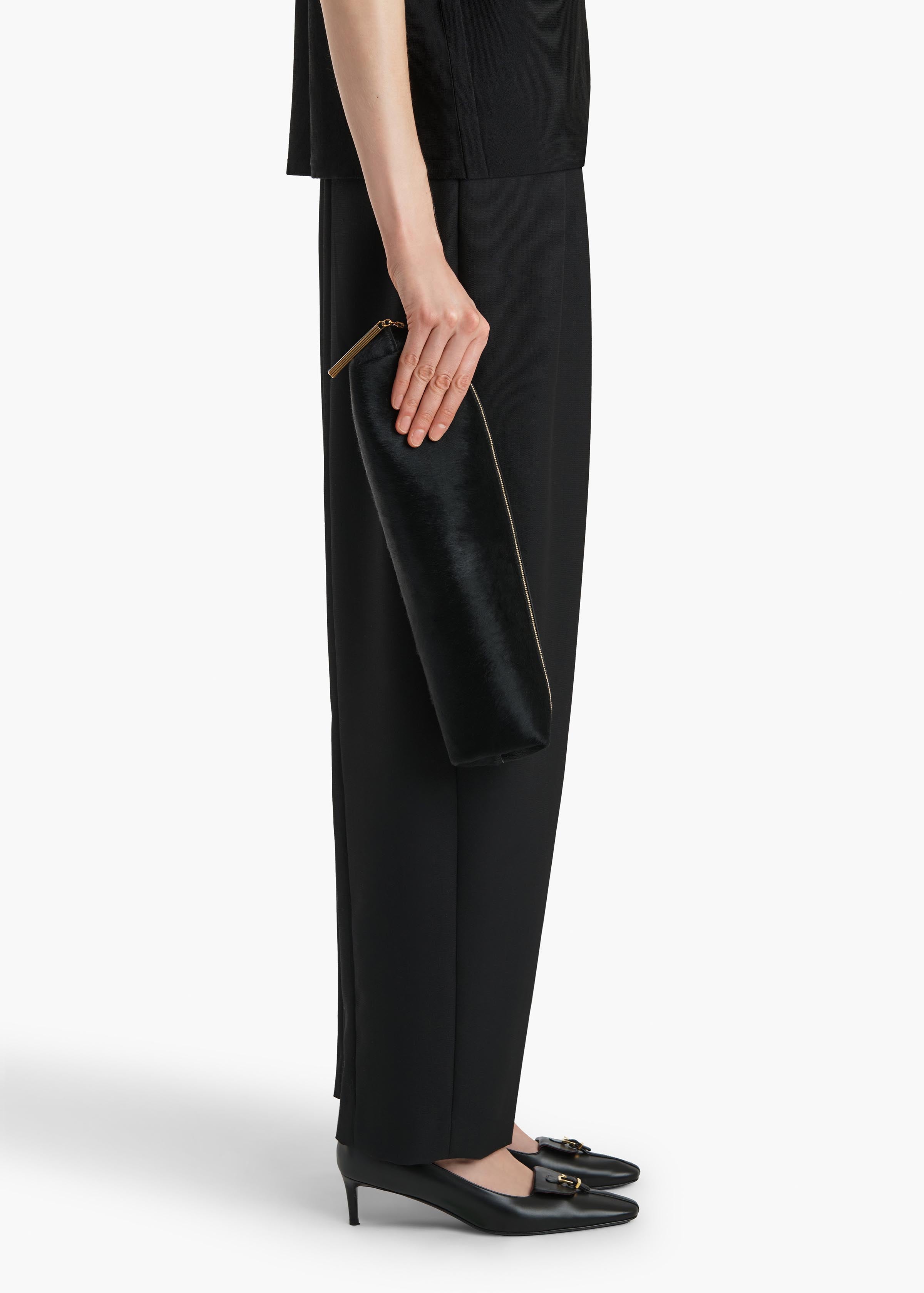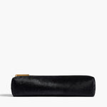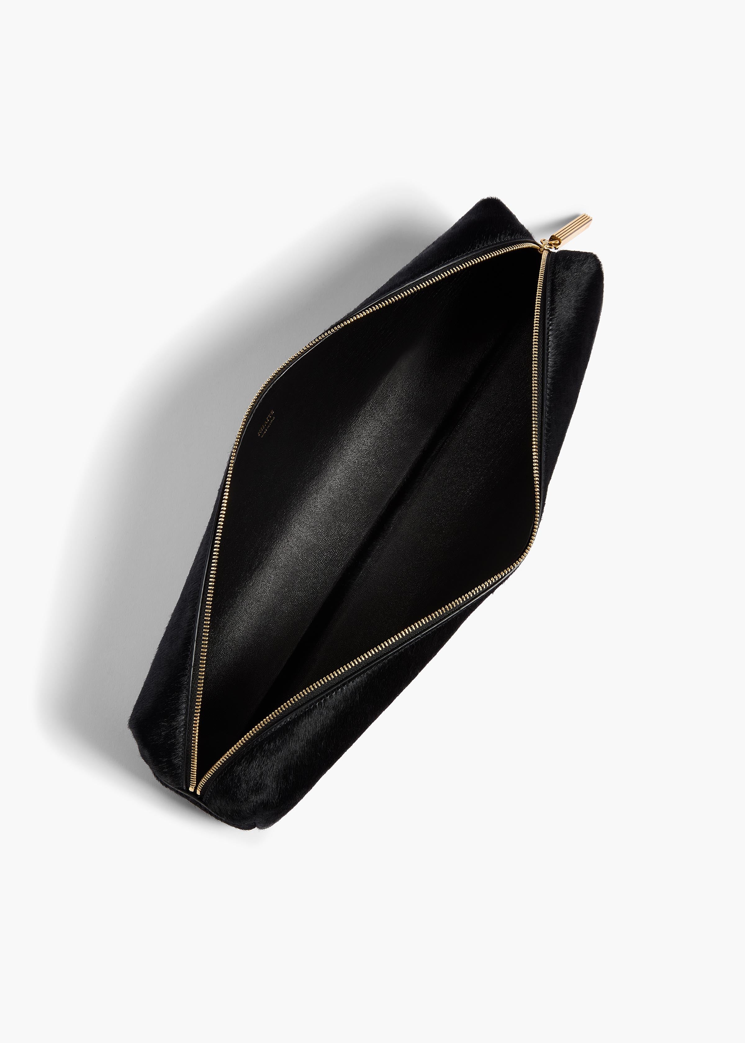 An east-west silhouette that scales up the familiar form of the pencil case into a sleek, capacious clutch in hair-on calfskin selected for its rich texture and polished look. Zippered top with signature Empire hardware.