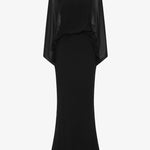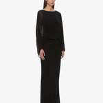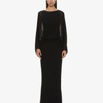 Cut in fluid black silk, draped front and floor-skimming column skirt